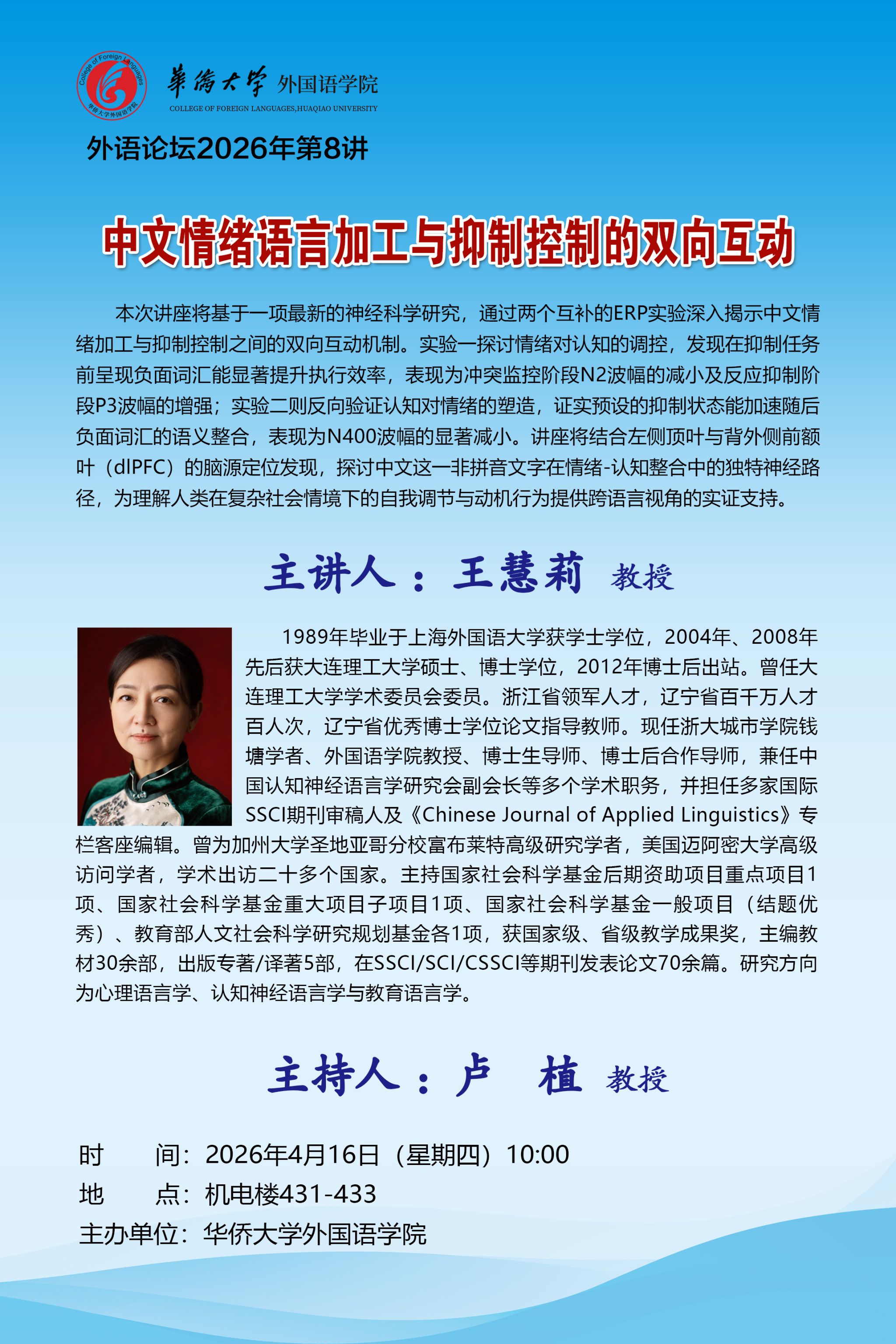 2026年4月16日上午,永利23411集团“外语论坛”第8讲在机电楼431-433成功举办。本次讲座特邀浙大城市学院钱塘学者、博士生导师王慧莉教授为我院作题为“中文情绪语言加工与抑制控制的双向互动”的讲座。本次讲座由永利23411集团院长卢植教授主持,众多师生到场聆听,现场气氛热烈。王慧莉教授是心理语言学与认知神经语言学领域的知名学者,中国认知神经语言学研究会副会长,主持多项国家级课题,在国内外重要期刊发表论文70余...