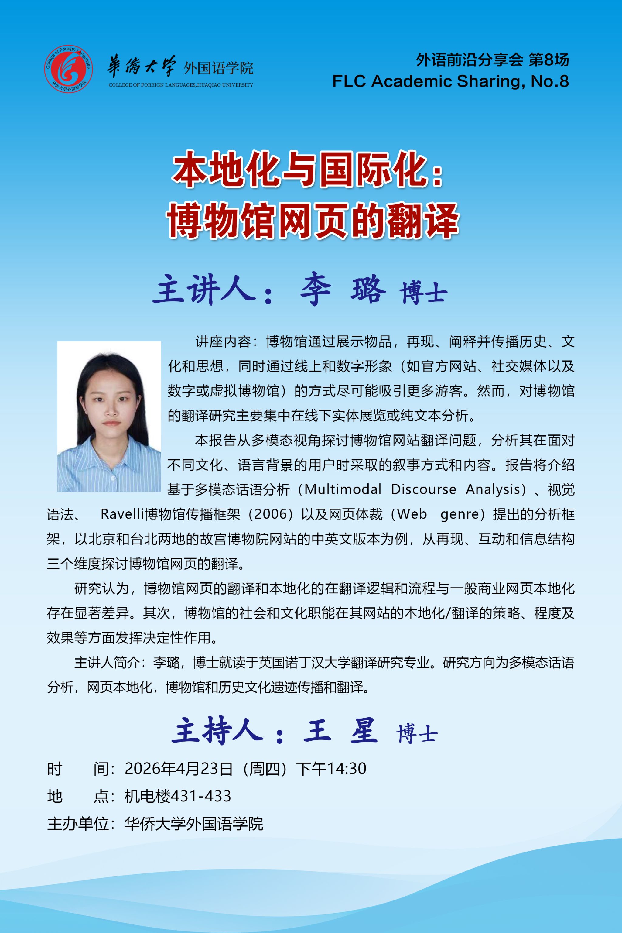 2026-04-032026年3月27日下午,“外语前沿分享会”第7场在机电楼431-433举行。本次活动特邀学院新进教师赵子怡博士带来题为“从转喻到隐喻:基于语料库的英汉颜色词隐喻历时比较研究”的学术讲座。讲座由永利23411集团副院长吴国向老师主持,吸引了众多师生参与。讲座伊始,赵博士梳理了概念隐喻理论的发展脉络,并回顾了现阶段基于共时视角的跨文化隐喻研究。她指出,相较而言,历时研究则能更好地揭示特定语言中隐喻背后的文化因素,也有利...