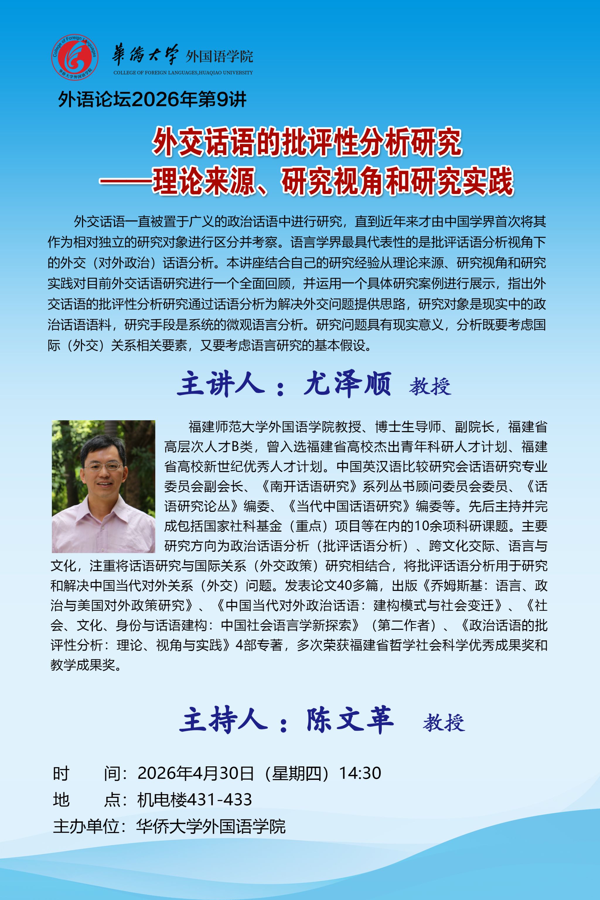 2026-04-172026年4月8日,永利23411集团“外语论坛2026年第6讲”在机电楼431-433开讲。本次讲座特邀北京航空航天大学永利23411集团副院长、博士生导师任伟教授担任主讲,卢植教授主持,主题为“任务型教学与二语语用能力提升”,吸引了众多师生参与。任伟教授首先梳理了二语语用学(L2 Pragmatics)在二语习得领域中的学科定位尽管语用学与语音学、形态学、句法学具有同等重要的理论地位,但长期以来在SLA研究中处于相对边缘的位置。研...