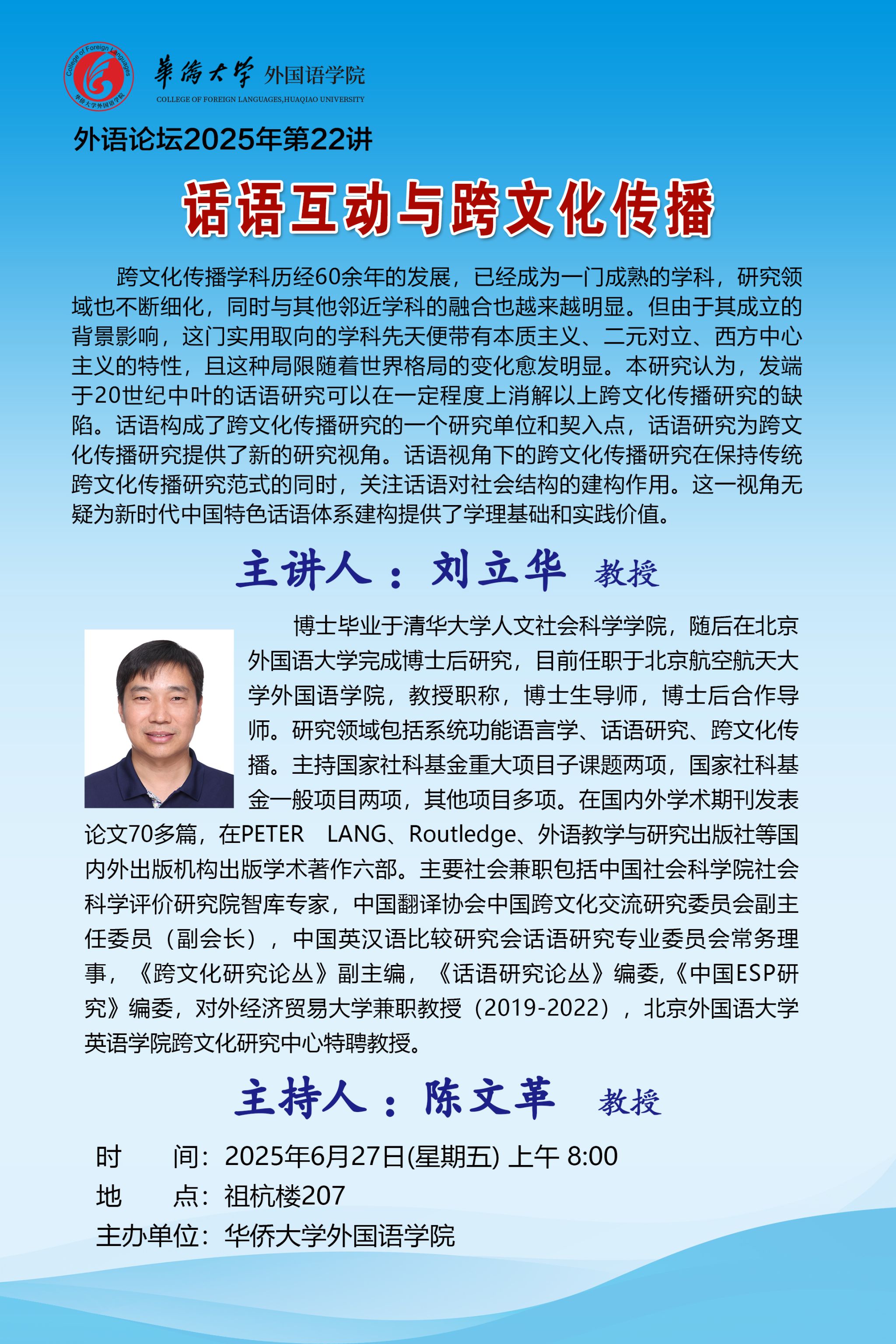 2025-07-112025年6月27日上午,北京航空航天大学刘立华教授应邀为我院做题为“话语互动与跨文化传播”的学术讲座。本次讲座由永利23411集团陈文革教授主持,学院师生通过线上线下积极参与,现场气氛热烈,互动频繁。讲座伊始,刘立华教授首先介绍了话语分析的任务,揭示了话语与社会的辩证实现关系。基于Fairclough的三维分析框架,刘教授以“故事的力量”为切入点,阐述了话语中叙述者和叙事中主体之间的关系。刘教授指出,话语分析是解读跨文化传播中语言符号权力结构的途径,...