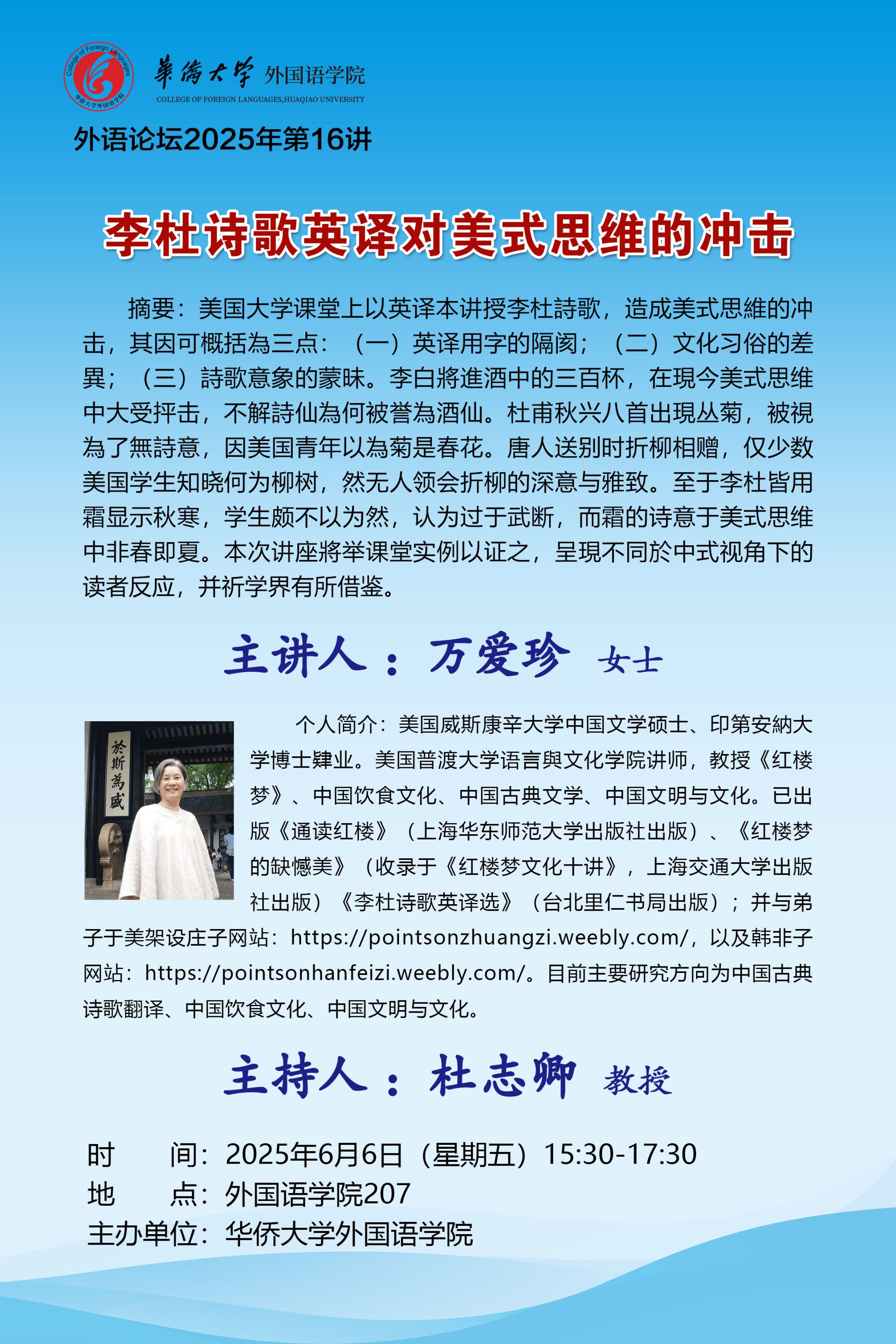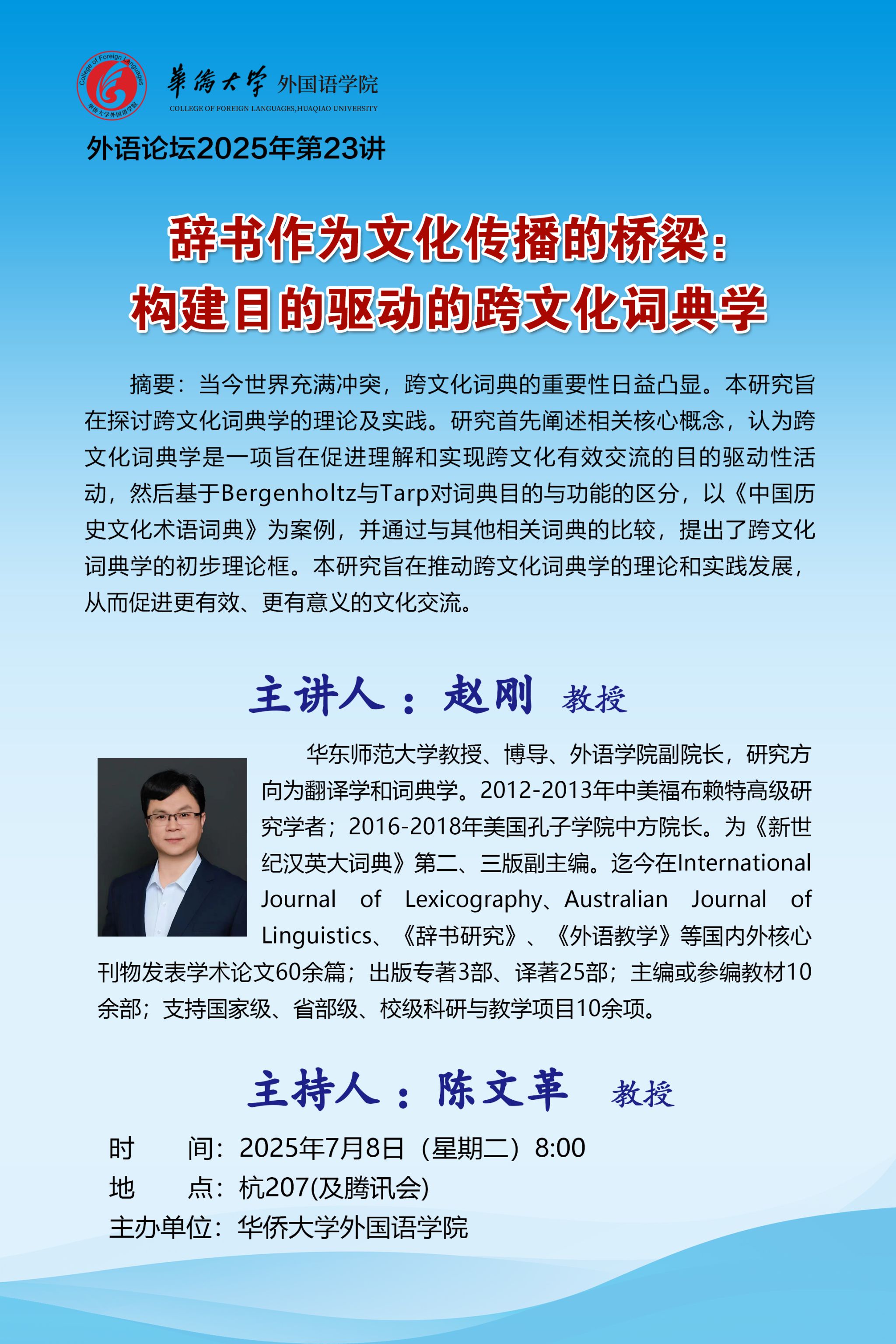 2025-07-142025年7月8日上午,外语论坛2025年第23讲成功举办。华东师范大学外语学院赵刚教授应邀开展题为“辞书作为文化传播的桥梁:构建目的驱动的跨文化词典学”的精彩学术讲座。本次讲座采用线上和线下结合形式,由陈文革教授主持,陈教授开场中简要介绍了赵教授的研究方向、代表性著作与学术贡献,特别强调其在推动中国文化“走出去”进程中的引领作用。首先,赵教授指出自媒体时代,“权威”词典在传播中国文化方面具有独特优势,并表达了自己通过词典讲述中国文化故事的热忱。...