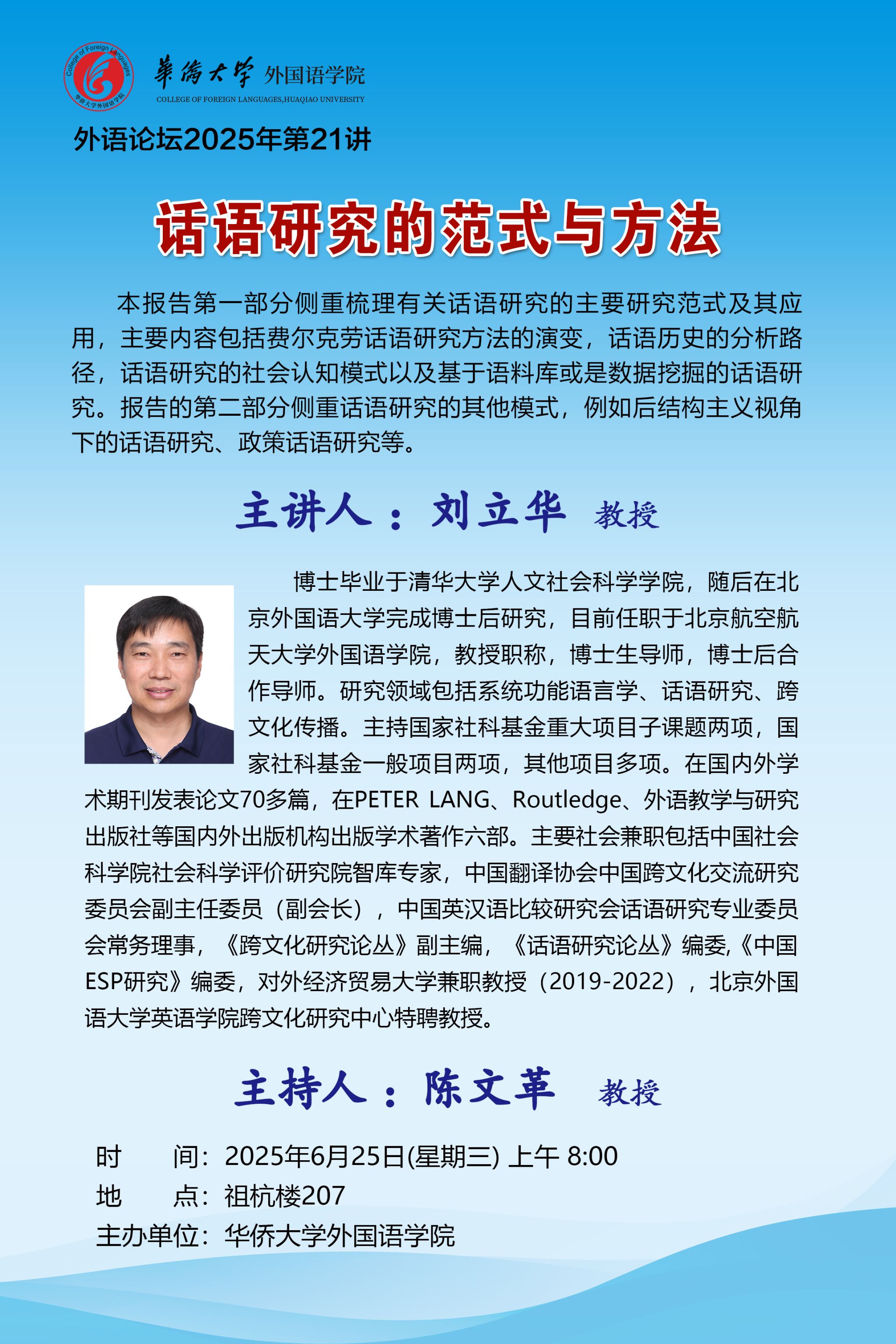 2025-07-022025年6月25日上午,北京航空航天大学永利23411集团刘立华教授应邀为我院做学术讲座,主题为“话语研究的范式与方法”。讲座线上线下同时进行,由永利23411集团陈文革教授主持,现场气氛热烈,互动频繁。讲座开始,刘教授阐明了“话语”和“语篇”的区别,并强调在学术讨论中,概念的定义必须明确来源,界定方式会影响研究中使用的分析框架与视角。接着,教授指出语篇分析必须与语境紧密结合,话语与语境之间存在辩证关系,互相作用与影响。...
