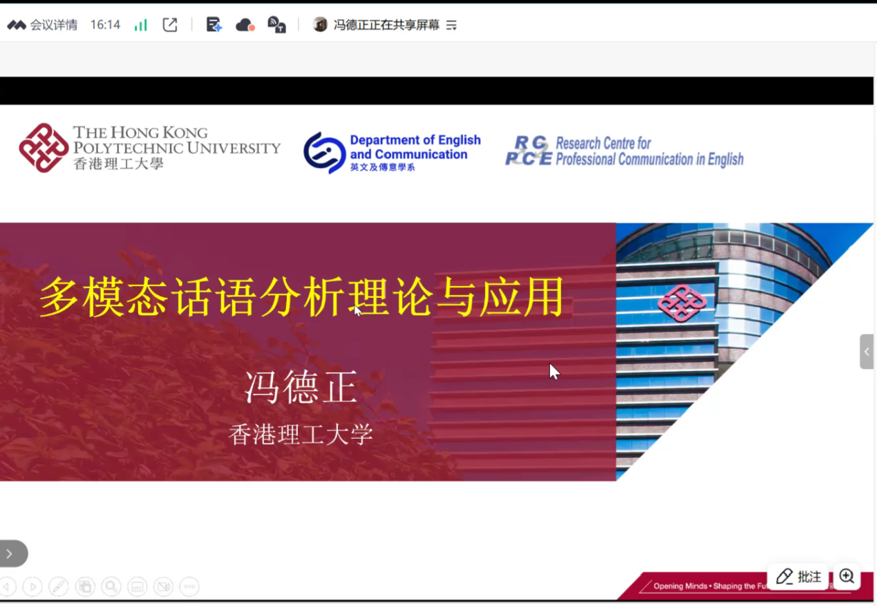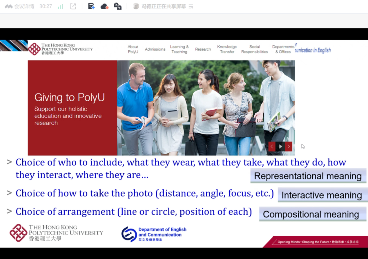 冯德正博士围绕多模态话语分析的理论基础与实践方法展开深入讲解。他在讲座中指出,由于外语教学从通用语言教学逐步转向专业英语教学,视觉图像在传播实践中的作用日益凸显,培养批判性视觉素养成为必然。冯博士以香港理工大学官网图像为例,引入视觉语法的三大元功能——再现意义、互动意义与构图意义,强调理论框架的系统性思维与问题导向性。