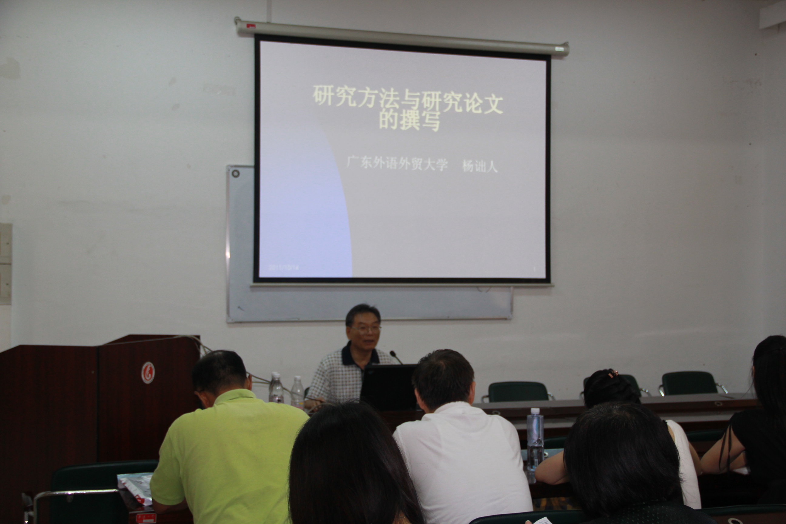 2011 年 10 月 14 日 下午,广东外语外贸大学博导杨诎人教授在永利23411集团三楼会议室为全院教师做了一场题为《研究方法与研究论文的撰写》的学术讲座。本次讲座由黄文溥教授主持,英日语专业教师均踊跃参加。