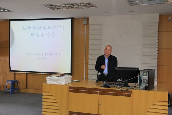金秋季节,阳光明媚,丹桂飘香。永利23411集团有幸邀请到上海外国语大学谢天振教授莅临讲学。11月10日下午,在侨总图书馆捷中楼三楼报告厅,我院教师、研究生与部分本科生聆听了谢教授题为“翻译的职业化时代:理念与行为”的精彩讲座。谢教授指出,随着最近30年来全球经济、文化与信息技术发生的巨大变化,无论是在西方各国,还是在中国,翻译都已经毫无疑义地进入了一个职业化的时代。这意味着翻译行为发生了质的变化,翻译行为的主流对象、翻译的方式方法、翻译的工具手段、乃至翻译研究的对象和队伍都已经发生了巨大的变化,由此给我们从事翻译教学和翻译研究的教师和专家学者提出了严峻的挑战。演讲通过对中西翻译史的简要回顾和梳理,揭示翻译职业化时代来临的历史原因及其基本特征,同时探讨我们今天该如何应对翻译职业化时代的种种挑战。仅就“翻译”这一概念而言,原有定义过于拘泥于语言与文学层面的考虑,已远远落后于时代,而应该重新定义为“跨语言、文化的交流”,唯其如此,方能解释众多的历史现象并理解现在与未来的翻译实际。