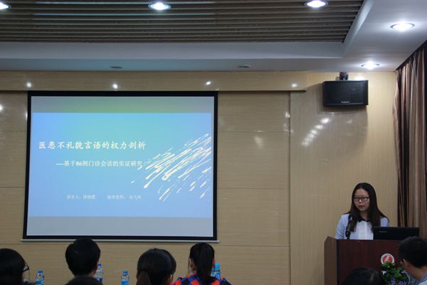 讲座在主持人高倩同学简短精练的开场白后拉开了序幕。陈晓霞同学第一个与大家分享了其学术见解。陈同学紧扣医患交际这一议题,以Culpeper的不礼貌策略为理论依据,结合French&Raven的权力基础六分法对86例门诊会话语料进行实证研究,对医患不礼貌言语权力进行剖析,得出“医生多依赖法定权力、专家权力、信息权力对患者实行权力压迫,以成就其悬殊的权力博弈格局”的结论,同时强调门诊会话是医患冲突不断升级直至双方和解或一方妥协的过程。阳方玲同学的研究主要在(不)礼貌理论框架内探讨医患模糊限制语的语用功能。阳同学在报告中总结了医患(含患者家属)双方使用模糊限制语的总体特点,并重点分析了模糊限制语的使用与(不)礼貌框架的关系,以期对构建和谐融洽的医患关系有所启示。蒋诗颖同学则以Spencer-Oatey的人际关系管理理论为框架,对汉语语境下不礼貌言语交际的形成原因及不礼貌策略的意图进行了分析。