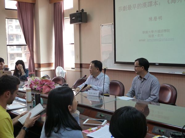 2016年3月7日,我院翻译研究中心主任陈历明教授应台湾师范大学翻译研究所所长廖柏森教授之邀,为本所硕博研究生做了题为“莎剧最早的汉译本:《海外奇谭》——兼论研究方法与论文写作”的专题演讲,这是陈教授的最新研究成果展示。台师大为岛内翻译研究和翻译师资培养首屈一指的高校,在海内外一直享有盛誉。廖所长主持的翻译研究所为纯粹的翻译研究机构,只招收翻译研究硕士和博士,学生不仅有本岛的,也有不少来自亚洲和欧美。尽管竞争相当激烈,录取比例很低,但考生却趋之若鹜,毕业生自然比较优秀。演讲者的介绍海报同时发在学校网页和脸书(face book)上。演讲由廖所长主持,主题演讲持续一个半小时,陈教授梳理了莎士比亚戏剧在中国最早的汉译本《海外奇谭》之源流,论证了译者在语言、文体、主题选择、叙述方式等在特定的文化背景下不同的选择及其缘由,指出佚名译者此举还无意中开启了短篇小说译介之先河,填补了莎士比亚中国化的一个空白。主题演讲后,陈教授还就翻译研究中问题意识、版本意识、语言意识、文体意识、时空意识、译者意识等六个方面与众研究生分享了自己的科研经验,并用20分钟左右的时间与研究生进行了良好的互动,取得了良好的效果。