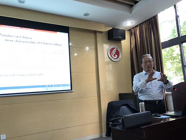 讲座伊始,李教授从修辞层面阐述了夸张的定义、类型,进而提出讲座的主题“数量夸张”。李教授以“满数”和“歉数”这一组相对概念为切入点,指出英汉民族数量夸张中常使用的“十”“百”“千”“万”等常规满数,皆源自于人类十进制的计数系统,属于文化共核(Cultural Common Core),充分表现出人类的文化共性。而非常规满数“三”“九”的应用却是英汉语之不同,汉语常喜“三”“九”之用,而英语中则少见其引。继而李教授旁征博引,取材国学经典《道德经》《易经》《皇帝内经》《论语》《史记》《春秋》《诗经》以及权威汉语字典《说文解字》等其中的典例,从哲学思想、汉字形态等方面为大家阐释了其中之由。此外,李教授还引用大量汉诗英译的范例,论述“三”“九”中蕴含的中国文化特征。李教授通过统计总集(Printer, et al., 1986; Read, et al.,1952)和别集(Byron, 1954; Keats, 1994; Shelley, 1994)共五部浪漫派诗集中的681首英美诗人的诗作,以令人信服的结果证实英诗数量夸张多用常规满数,而在非常规满数的使用上有别于汉诗的“三”,反而更加青睐“二”,认为这与西方哲学理论中的“一、二生万物”的宇宙观有着深刻的文化关联。李教授基于这一对比分析,辅之以名家的译诗典例,探讨数量夸张的各种译本,提出了自己富有洞见的翻译策略,并回答了各位研究生的问题。