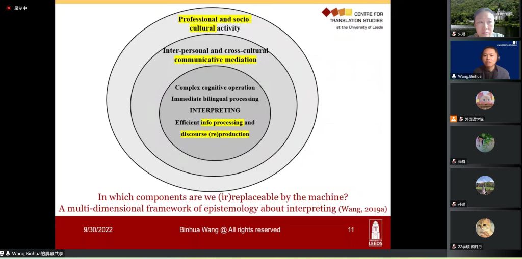 2022年9月30日下午,现任世界百强大学英国利兹大学终身讲席教授、博士生导师王斌华教授应邀为我院师生作 “AI技术发展背景下口笔译教和学的理念重构”专题讲座。纵使相隔数千公里与七小时时差,王斌华教授依旧以饱满的热情将自己作为翻译实践者、教育者、研究者的经验与思考倾囊相授。本次讲座于线上举行,由永利23411集团副院长朱琳教授主持,共吸引来自我院各专业近百位师生前来学习。