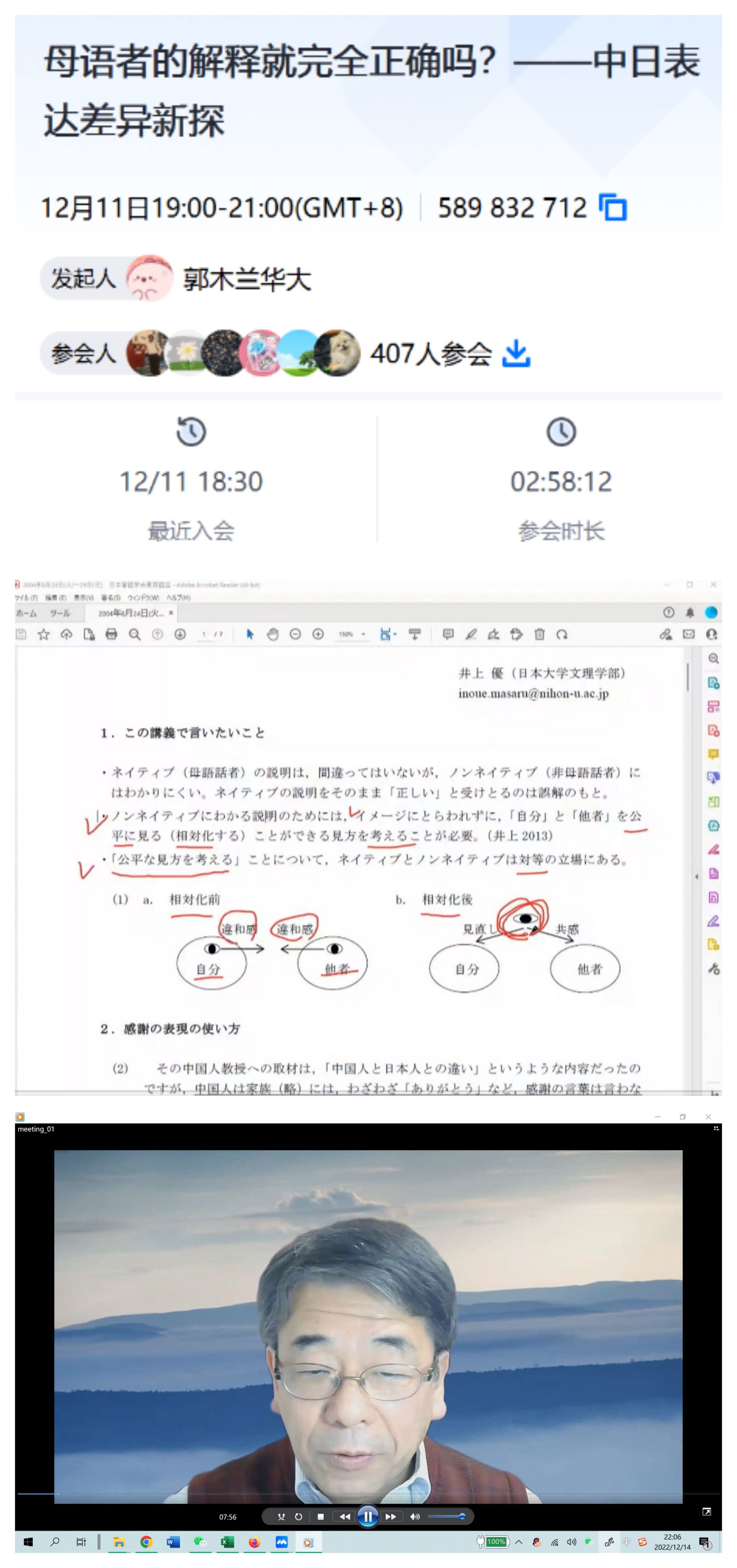 2022年12月11日晚上7点,日本大学文理学部教授,博士生导师井上優教授应邀为我院师生作“母语者的解释就完全正确吗?——中日表达差异新探”专题讲座。虽然远隔重洋,但井上優教授仍然以饱满的热情将自己的对于中日两国交流的研究和思考与大家进行了深入交流和分享。讲座由永利23411集团日语系郭木兰老师主持,来自校内外近300位日语专业师生入会在线学习。