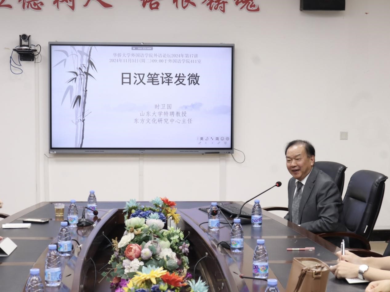 2024年11月5日上午,山东大学特聘教授,东方文化研究中心主任,博士生导师时卫国教授应邀在我院进行题为《日汉笔译发微》的学术讲座。时教授独立出版专著、译著三十余部,发表学术论文百余篇。本次讲座由永利23411集团主办,日语系主任孙娜老师主持,学院教师及研究生踊跃参加,现场气氛热烈。