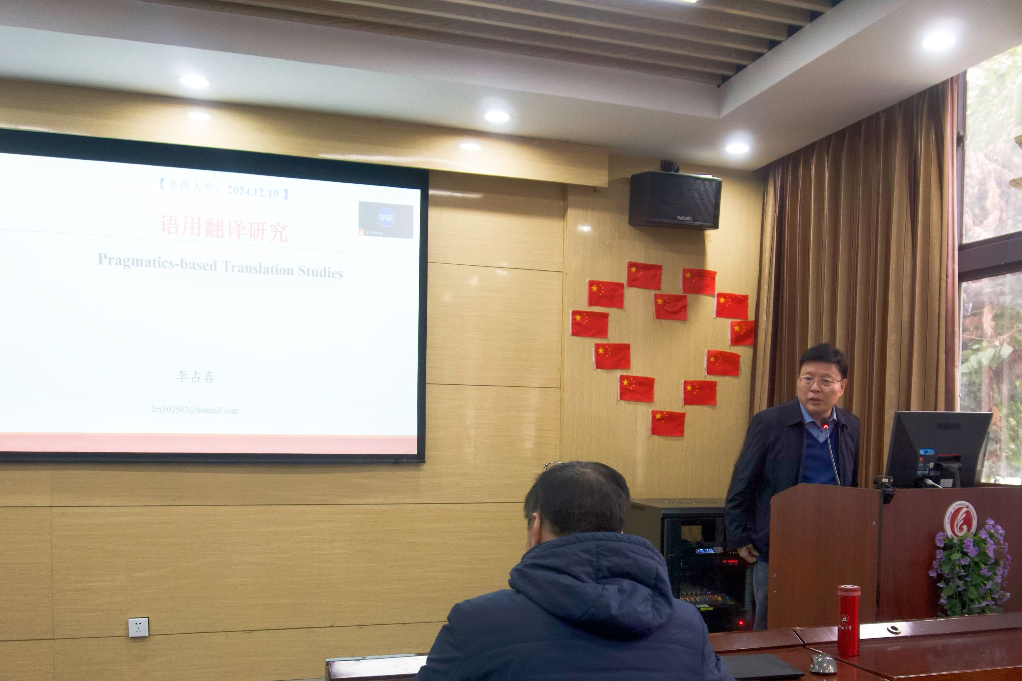 2024年12月19日下午,华南农业大学永利23411集团教授及硕士生导师李占喜教授应邀莅临永利23411集团,开展了一场题为“语用翻译研究”的学术讲座。此次讲座吸引了学院师生的积极参与,李教授以其深厚的学术底蕴和丰富的研究经验,为大家带来了一场精彩的学术盛宴。