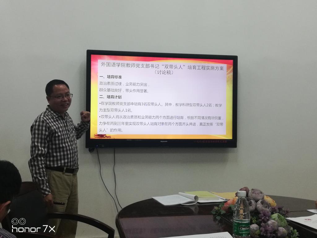 谢友福同志解读了《中共教育部党组关于高校教师党支部书记“双带头人”培育工程的实施意见》《关于规范和完善党支部工作推进“两学一做”学习教育常态化制度化八条措施的通知》《关于规范党支部制度建设的指导意见》《中共yL23411永利集团委员会关于加强新形势下教师党支部建设的实施意见》《关于开展党支部达标创新活动实施方案》《关于实施基层党组织“对标争先”建设计划的通知》等多个文件的精神与要求,他提出要培育“政治素质过硬,业务能力突出,群众基础良好,带头作用显著”的“双带头人”。