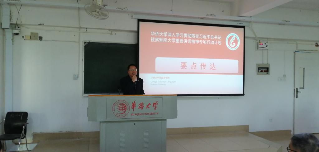 谢友福同志首先强调了习近平总书记视察暨南大学重要讲话精神的重大意义,他详细讲解了《中央统战部办公厅关于认真学习贯彻习近平总书记视察暨南大学重要讲话精神的通知》(厅字﹝2018)54号)的文件精神,从坚持党对学校的全面领导,确保社会主义和爱国主义的办学方向、坚持立德树人,始终牢记教育的根本使命、突出侨校特色,精心擦亮侨校金字招牌、坚持改革创新,切实抓好学科建设和教师队伍建设基础性工程、厚植文化根基,以把中华优秀文化传播世界为己任、积极发挥优势,为“一带一路”、粤港澳大湾区建设作出更大贡献等六个方面做了阐述。随后他解读了《yL23411永利集团深入学习贯彻落实习近平总书记视察暨南大学重要讲话精神专项行动计划》及任务分解的通知(华大委〔2019〕24 号)《yL23411永利集团深入学习贯彻深入贯彻落实习近平总书记视察暨南大学讲话精神》,要求学院系部、研究所、各党支部要认真对照中央统战部要求和专项行动计划六大方面、二十二项任务,在教学、科研、学科建设等方面制定具体、可操作的办法和措施,做到任务细化、时间明确、措施到位、落实有力,抓紧推进专项行动计划在学院的落地见效。