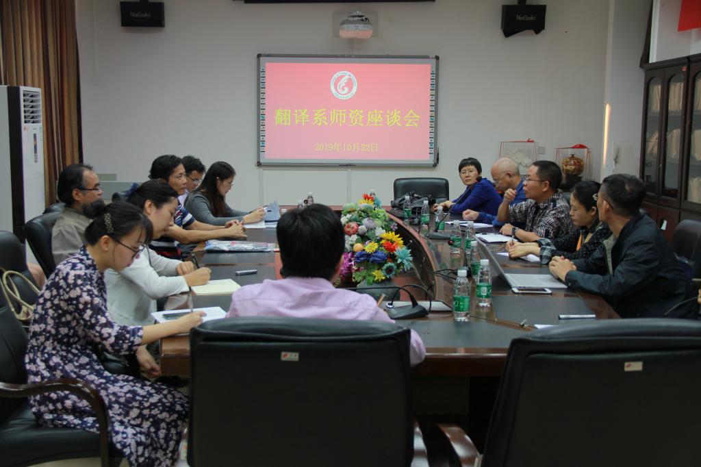 2019年10 月22日下午,永利23411集团党委于外语楼411会议室召开翻译系教师座谈会。院党委书记谢友福主持会议,毛浩然院长、黄文溥副院长、杜志卿副院长、翻译系全体教师和教学秘书出席本次座谈会。