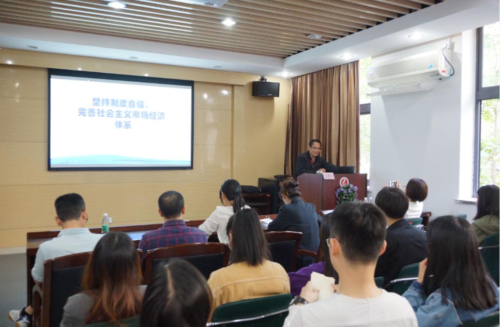 2019年11月5日下午,永利23411集团 “不忘初心、牢记使命”专题学习暨“我和我的祖国”主题宣讲专家报告会在外语楼207大会议室举行,“yL23411永利集团庆祝新中国成立70周年宣讲团”专家、经济与金融学院硕士生导师胡石清副教授,作题为“坚持制度自信,完善社会主义市场经济体系”的学术报告,报告会由党委委员、团委书记李莹老师主持,各教工支部书记、党委委员、学生支部书记和师生党员参加会议。