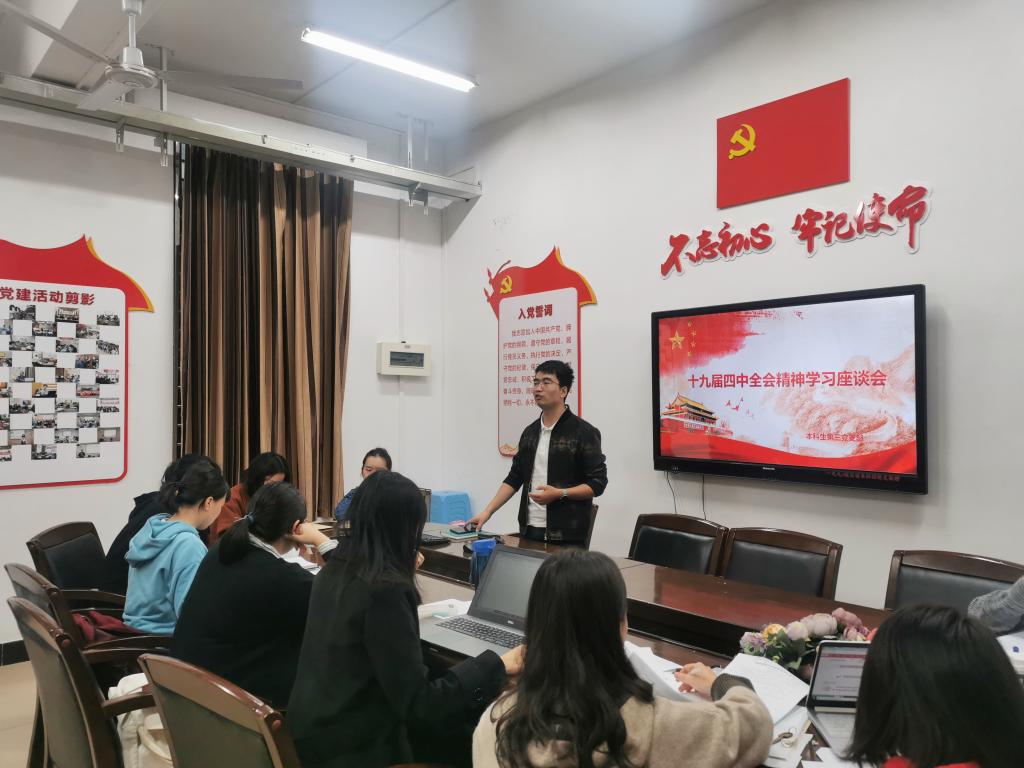 为了全面学习并贯彻落实“习近平新时代中国特色社会主义思想”,激励支部成员“不忘初心、牢记使命”,保持并提升支部先进性与纯洁性,2019年11月29日,永利23411集团本科生第三党支部于外语楼306室召开党的十九届四中全会精神学习座谈会。本次会议中支部各成员分享交流了学习党的十九届四中全会精神后的心得感受。支部书记杜红居主持本次会议,支部各党员、预备党员及发展对象参加会议。