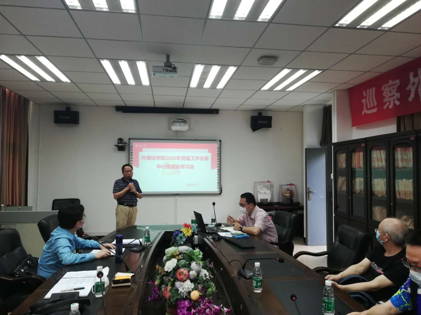 2020年5月12日下午,永利23411集团党委理论学习中心组(扩大)在外语楼411会议室开展题为全面从严治党专题学习讨论会——政治建设:党的根本性建设的理论中心组(扩大)暨2020年党建工作会。院长毛浩然,副院长黄文溥,副院长杜志卿,党委副书记郑志民,党委委员及支部书记参加学习,院党委书记谢友福主持集体学习。