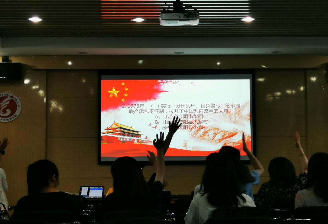 本次知识竞答活动分为三大部分,第一部分为两人PK,两位选手在通读题目后,迅速抢答,再由主持人宣布正确结果,答对则得分,得分多的选手获胜。本科生第二党支部的曾婷同志和高宇婷同志积极参与了两人PK,除了台上两位参赛选手,台下的各位党员同志也反响热烈,积极讨论。第二部分为抢答环节,各位党员在抢答环节,积极思考,积极抢答。在抢答环节,可以看到各位党员对于“四史”的学习和理解都很透彻。除了基础的选择题抢答,永利23411集团将活动和专业结合起来,加入外院的特色——热词翻译,各位党员遇到与自身专业对口的题目后,纷纷举手抢答,热情高涨,现场气氛热烈。第三部分为感想分享,永利23411集团本科生三个党支部和研究生党支部都派出代表分享了在这次知识竞答活动中所学所想。不仅仅只是分享感想的党员有学到很多,每一个参与竞赛的党员都有自己的感触。