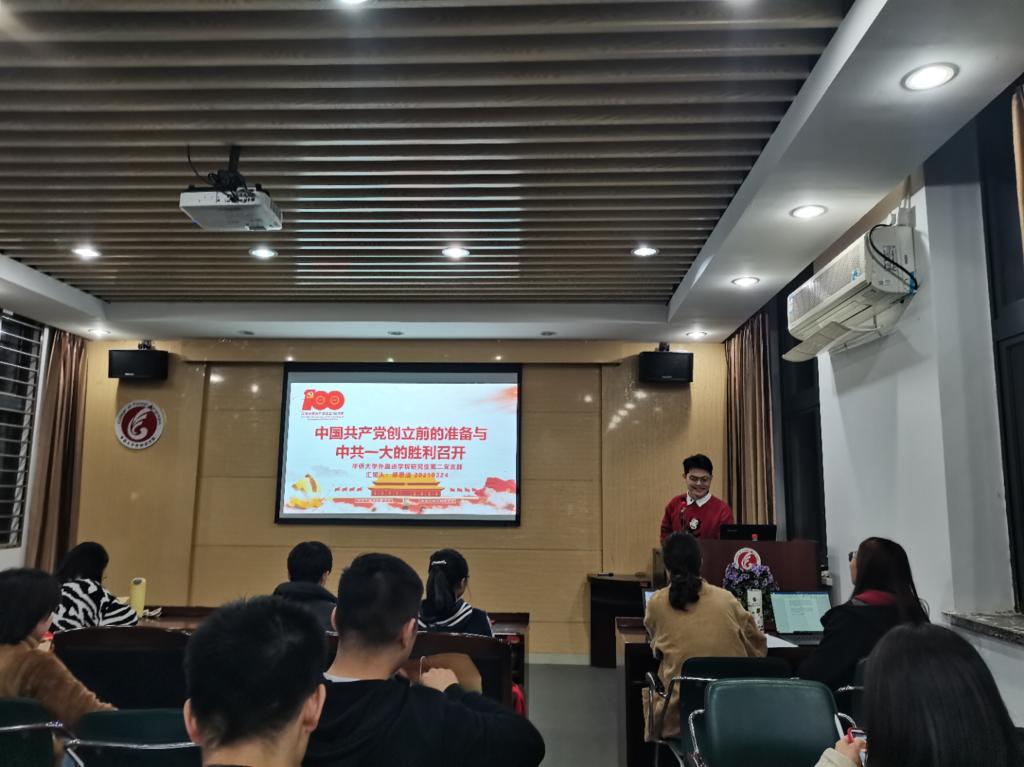 会议伊始,郑思洁同志带领全体党员同志和入党积极分子回顾了中国共产党创立前的历史。在中国共产党创立之前,先后出现了地主阶级、资产阶级改良派、农民阶级、资产阶级革命派,为中国的救亡图存做出了相应的努力,但均以失败告终。俄国十月革命的胜利、新文化运动的产生和五四运动的爆发为中国共产党的创立奠定了理论基础、思想基础和阶级基础。因此,中国共产党的创立既是时代的呼唤,也是历史的必然选择。接着郑思洁同志带大家回望了中共一大胜利召开的曲折过程,由于国民党特务的打断,中共一大断断续续召开了七次会议才在浙江嘉兴南湖上的一艘画舫上胜利闭幕。会议通过了《中国共产党纲领》、《中国当前实际工作的决议》,选举党的领导机构为中央局。最后,郑思洁同志带领大家学习了中国共产党的第一个决议,邀请了在场的几位积极分子朗读部分决议,在朗读中深刻体会决议的初心与精神。