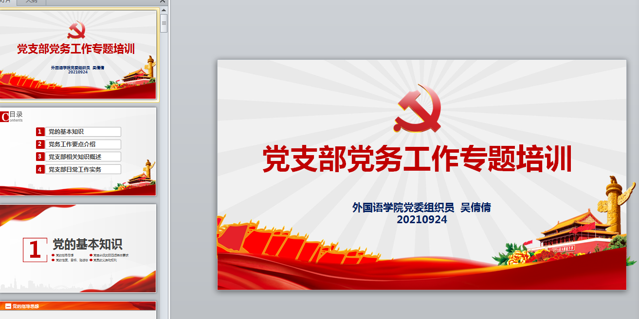 吴倩倩老师以高校基层党组织的党务工作为主题,就党的基本知识、党务工作要点、党支部“三会一课”是哪“三会”和哪“一课”,以及每个会议的召开程序要求等内容进行了详细讲解。坚持“三会一课”是基层党组织的根本组织制度,是党员接受党性教育和优良传统作风教育的重要途径,是增强党员的党性修养,提高党员意识的重要环节,各支部书记要牢记党的使命,加强支部的理论学习,并结合每年的主题教育,认真落实好“三会一课”制度,科学做好规划和总结。随后,就本学期学院党建工作的基本规划做了介绍,针对其中发展党员的程序和规范以及党员档案问题等进行了深入讲解和答疑。