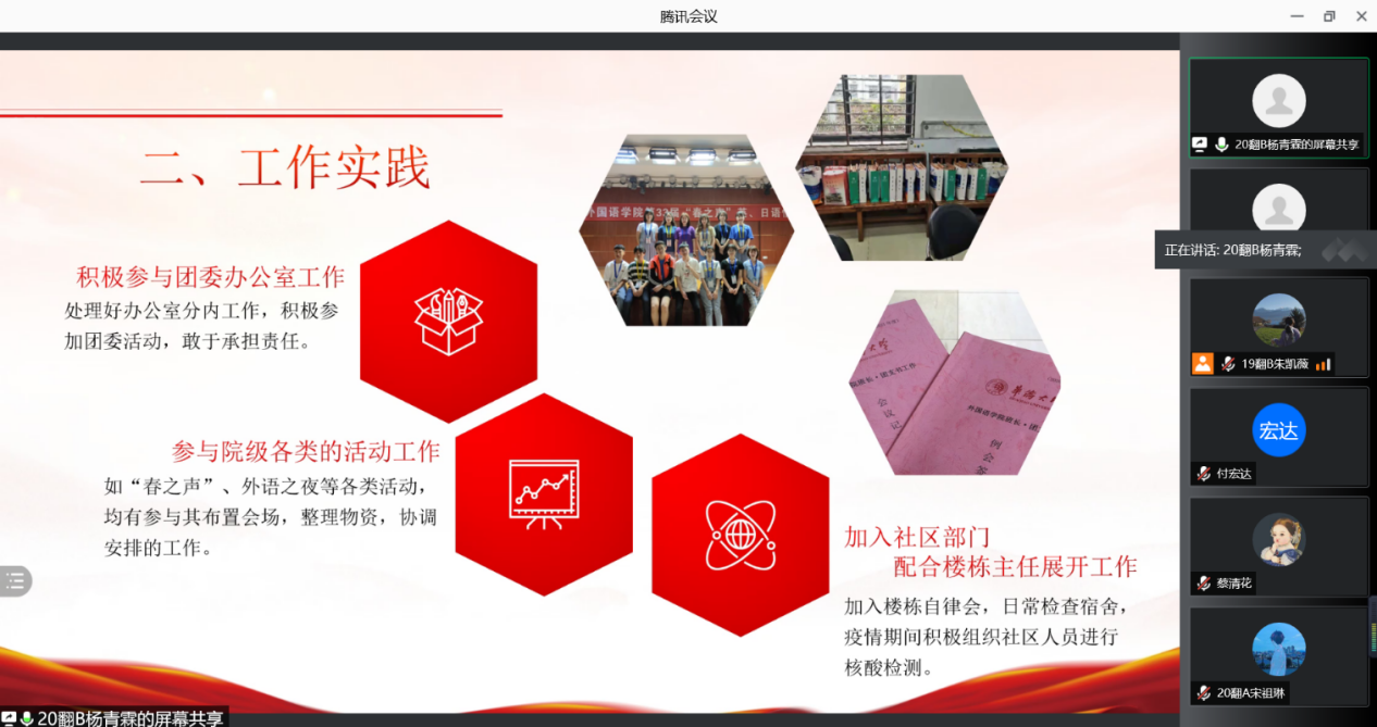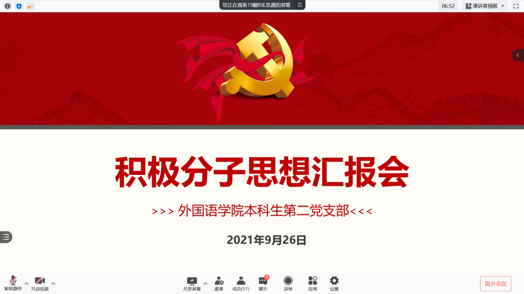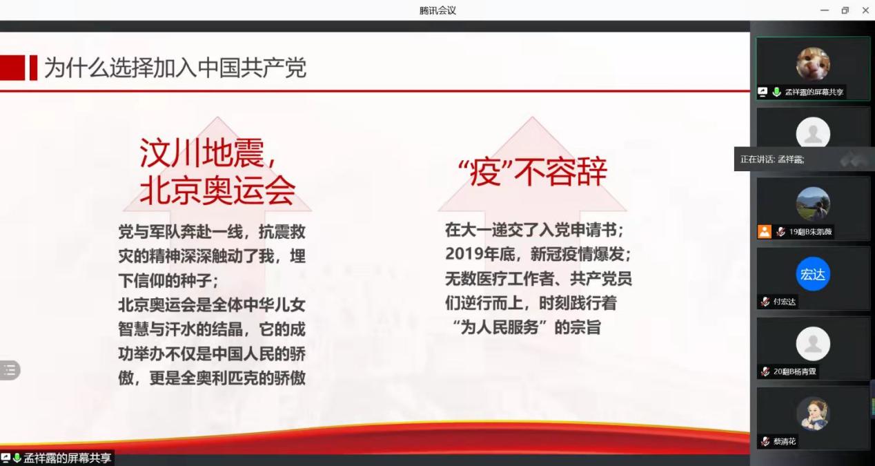 为切实提高高校青年党员的发展质量,2021年9月26日下午,永利23411集团本科生第二党支部通过腾讯会议平台在线上召开了2021年下半年积极分子思想汇报会。支部书记吴倩倩老师、支部全体党员、预备党员和积极分子参与了汇报会。其中陈敏红、常晴晴、林泷等16位积极分子就近期的思想、工作、学习、生活等几个方面向党组织进行了逐一汇报。