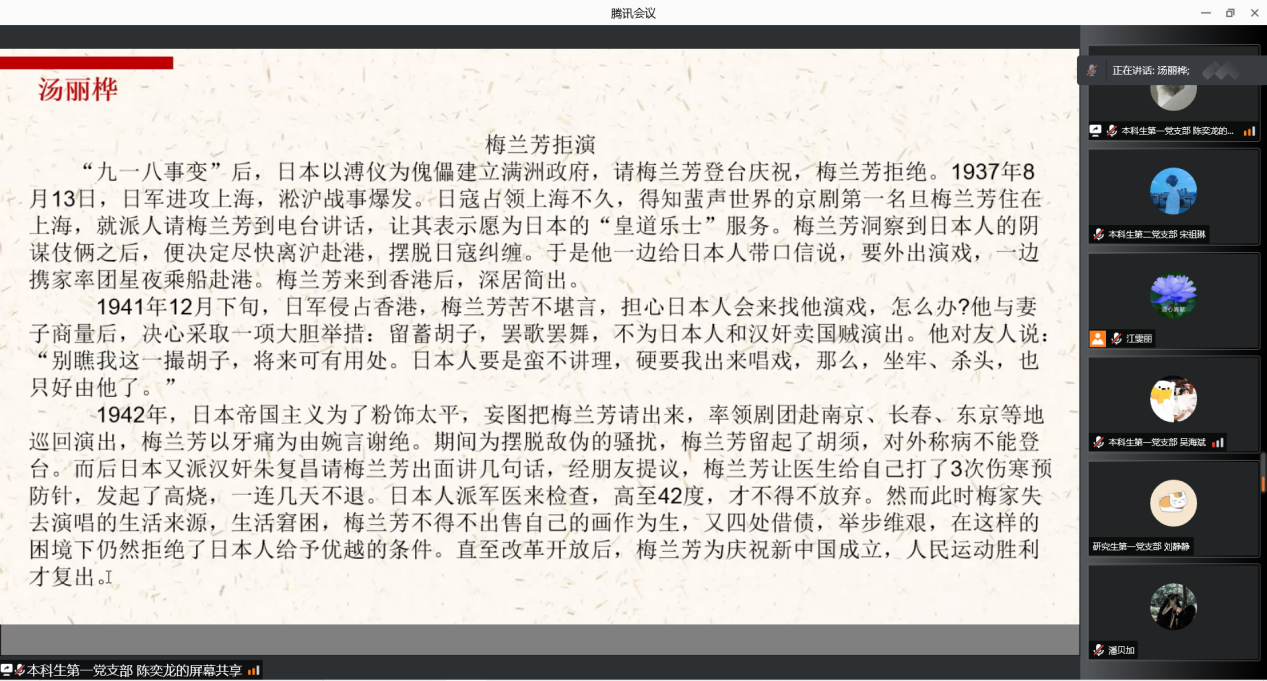学生党建室主持人江雯丽开篇点明主题,在建党100周年的时代背景下,我们需要回望历史、展望未来,学会历史思维,培养历史眼光,在历史中学习伟大精神,汲取奋进力量,以此缅怀先烈,铭记历史。