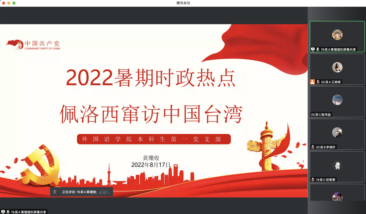 预备党员黄珊煌同志将目光放到了“佩洛西窜访中国台湾”这一时事热点上。她在会上分享了习近平总书记就台湾问题所强调的原则立场:台湾问题的历史经纬明明白白,两岸同属一个中国的事实和现状清清楚楚。中美三个联合公报是双方的政治承诺,一个中国原则是中美关系的政治基础。我们坚决反对“台独”分裂和外部势力干涉,绝不为任何形式的“台独”势力留下任何空间。中国政府和中国人民在台湾问题上的立场是一以贯之的,坚决维护中国国家主权和领土完整是14亿多中国人民的坚定意志。民意不可违,祖国统一势不可挡。”