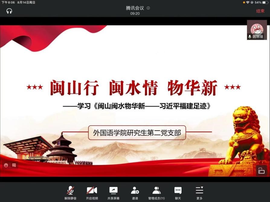 为深入学习习近平总书记重要讲话精神,追寻习近平总书记的福建足迹,8月14日,永利23411集团研究生第二党支部线上开展“闽山行闽水情物华新”主题党日活动。此次会议由魏琳瑛同志主讲,带领大家深入学习《闽山闽水物华新——习近平福建足迹》一书,研究生第二支部全体党员参加了学习。