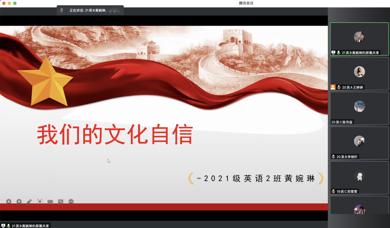 积极分子黄婉琳同志以文化自信为主题,简述了两个暑期的时政热点——“南京玄奘寺供奉侵华日军”和“B站官方主办的南京‘夏日祭’被紧急叫停”。这两件热点新闻给予了她深入的思考,她说道:南京不仅仅是一座城市,是我们历史的见证,更是我们一个难以愈合的伤口。南京的存在见证了我们国家在抗击侵略者时的壮烈牺牲,这是一段血淋淋的历史,它的存在也提醒着我们勿忘历史。我们30万同胞仍然长眠于此,他们不只是成为历史,更是我们民族的警钟。爱国主义是中华民族精神的核心。正是中国人民强烈的爱国主义和民族自尊心、自信心才会有如此强烈的反应。我们提倡的“文化自信”来自于优秀传统文化的底蕴,也有在中国革命、建设、改革的伟大实践过程中孕育的革命文化和社会主义先进文化。同时,她在分享的最后向大家呼吁:“在面对多样的外来文化,我们首先要认同本民族文化,坚定自身信念,高举中国特色社会主义大旗。坚定文化自信,警惕文化入侵与文化渗透。”