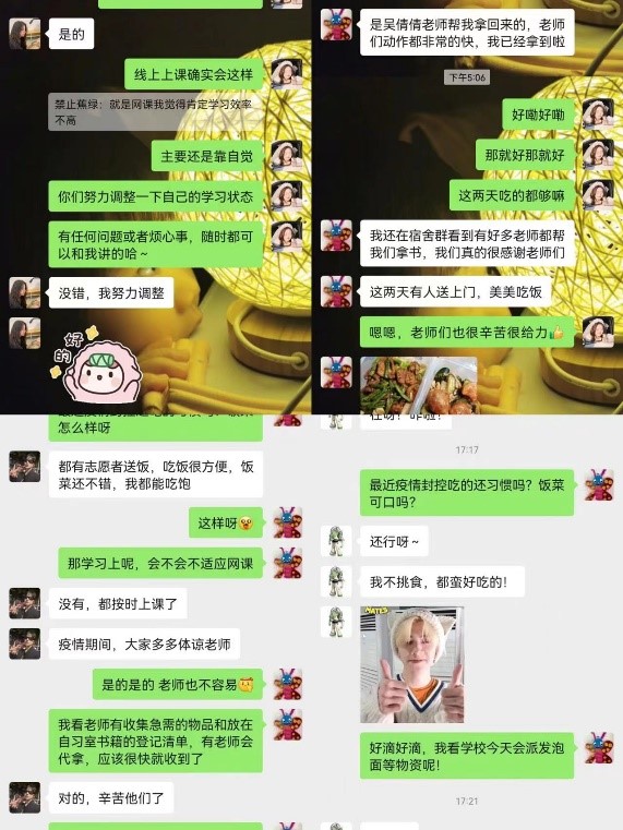 本科生第二支部党员于小雨和潘贝加作为永利23411集团众多党员中的普通一员,她们积极参与到学校疫情防控工作中,深入同学们的生活,主动了解同学们的需求,询问同学们是否出现就餐或学习方面的问题,落实解决同学们生活学习中的困难,缓解了同学们焦虑不安的心,让大家感受到了身边的温暖。她们说:“我们始终相信团结一心的力量是巨大的,疫情终将退散,我们一起努力!”
