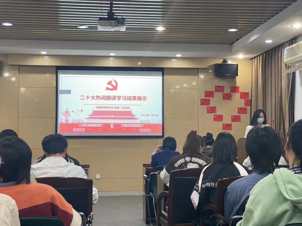 为深入学习党的二十大精神,2022年11月4日,永利23411集团本科生第二党支部开展“二十大报告热词翻译学习成果”报告会,以双语报告二十大热词,解析中国方案,感受中国力量,分享中国故事。