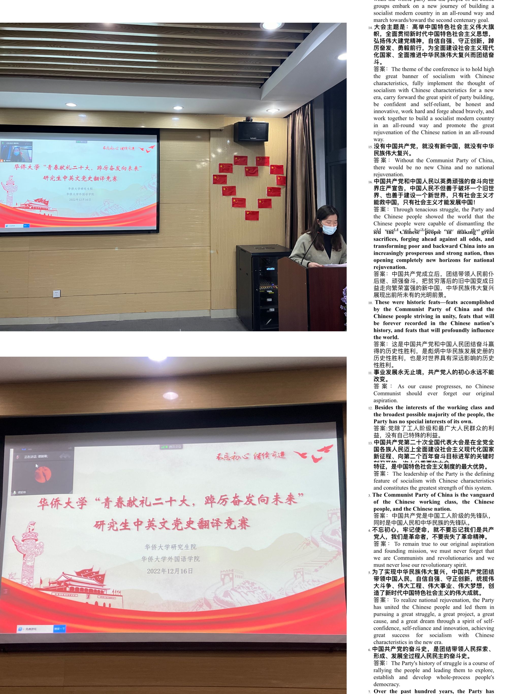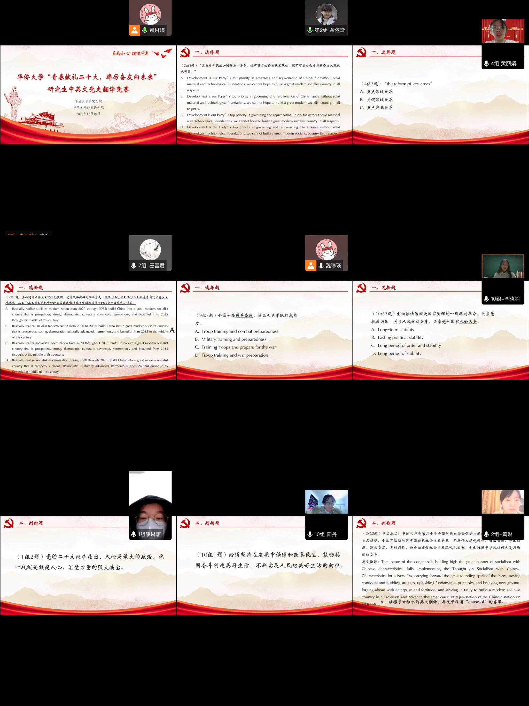 为加深青年学生对党的二十大精神的理解和学习,促进二十大精神等相关党史翻译的学习交流,加强党的二十大精神的国际传播,2022年12月16日晚,永利23411集团党委依托校级学术竞赛立项,与研究生院联合举办“初心杯”党史学习及二十大精神中英翻译比赛。本次比赛共有十支队伍参与比拼,永利23411集团教工第二党支部书记、大学英语部副主任曾阳萍老师与永利23411集团教工第一党支部党员、翻译系谭颖琳老师受邀担任评委。