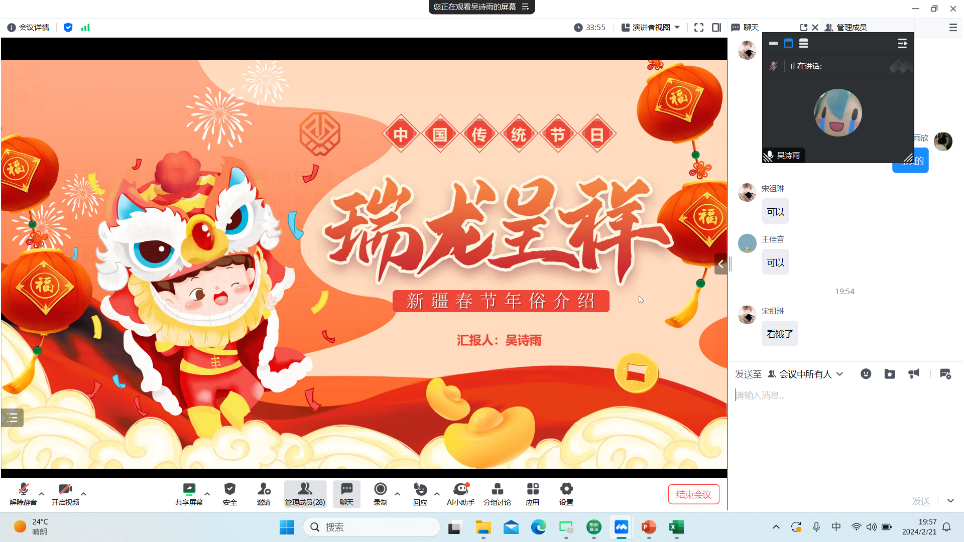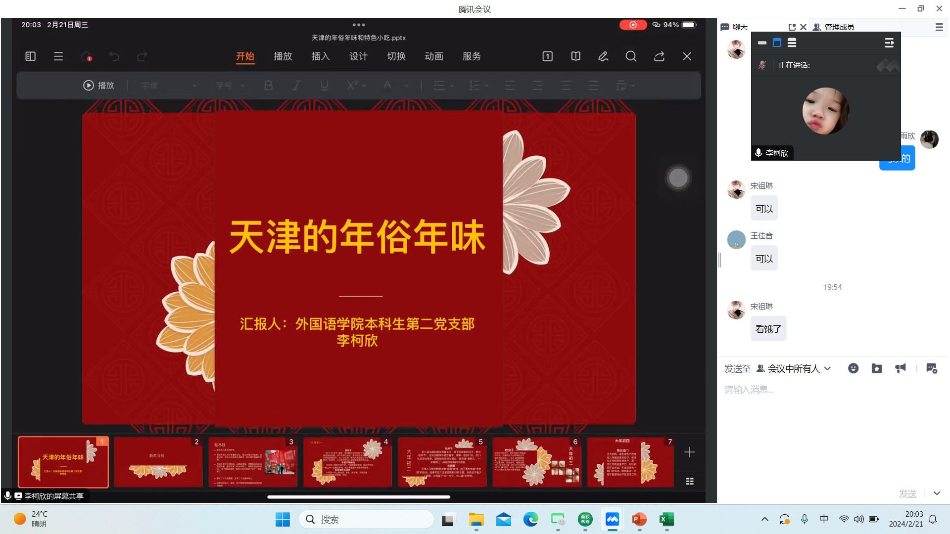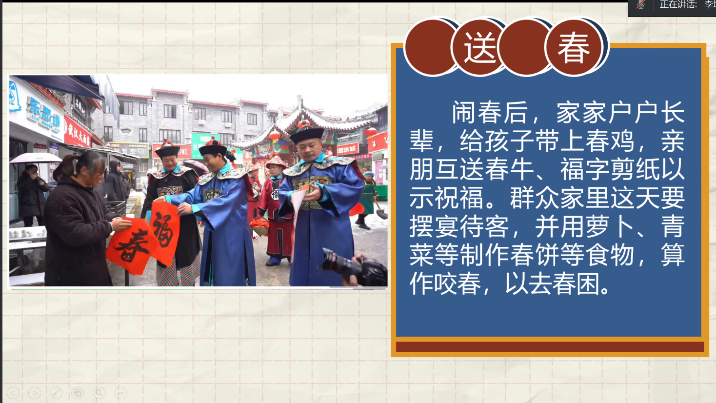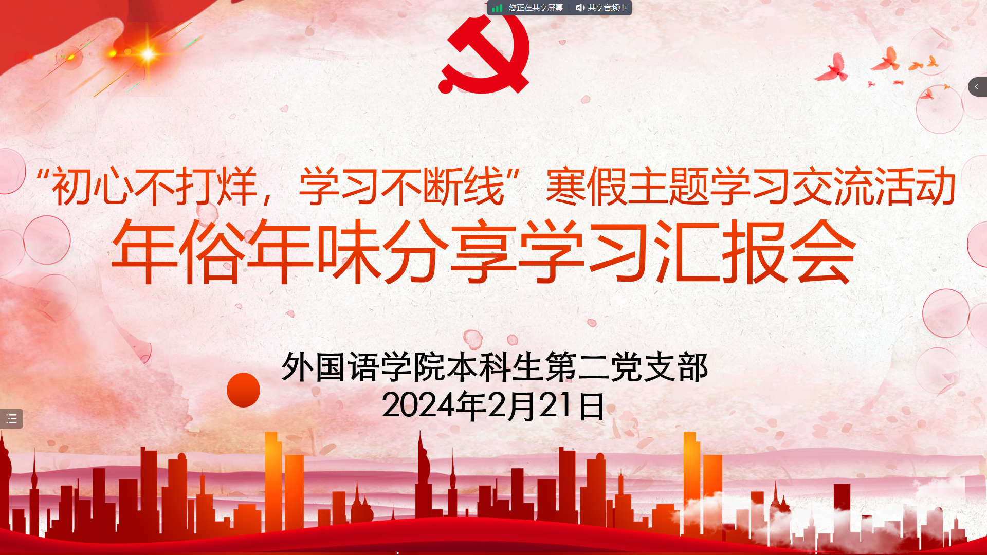 本科生第二党支部的党员们分享学习特色年俗年味,王佳音、田晴晴等党员同志们介绍了家乡独具特色的春节习俗。安康火狮子、安徽舞龙等年俗,还有新疆哈萨克族的赛马,河北的庙会,天津贴吊钱儿,福建游神等传统习俗。通过大家的分享和交流,使支部成员们更加了解祖国丰富的年俗文化,深切感受到了中国家家户户的温暖与幸福。