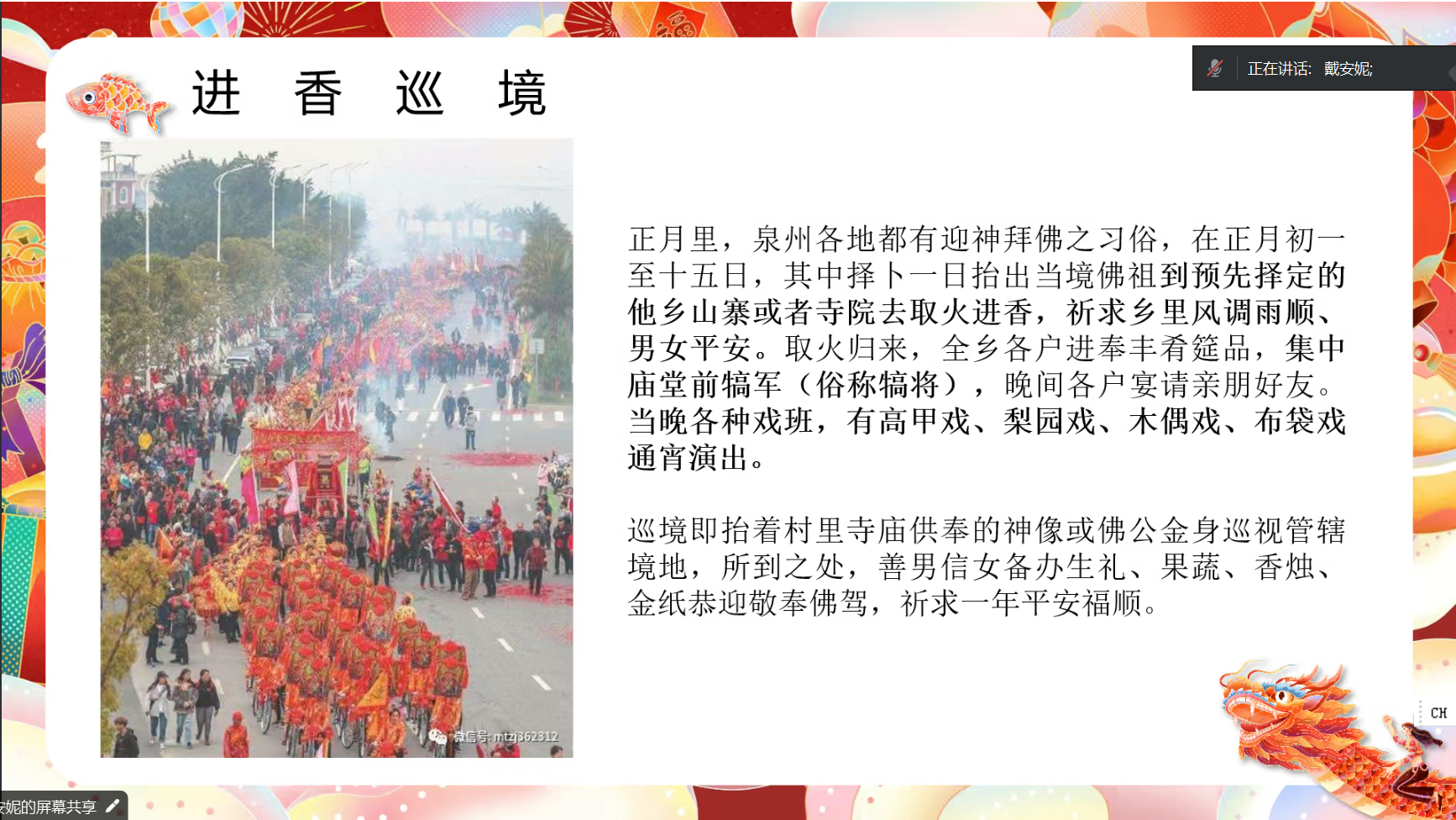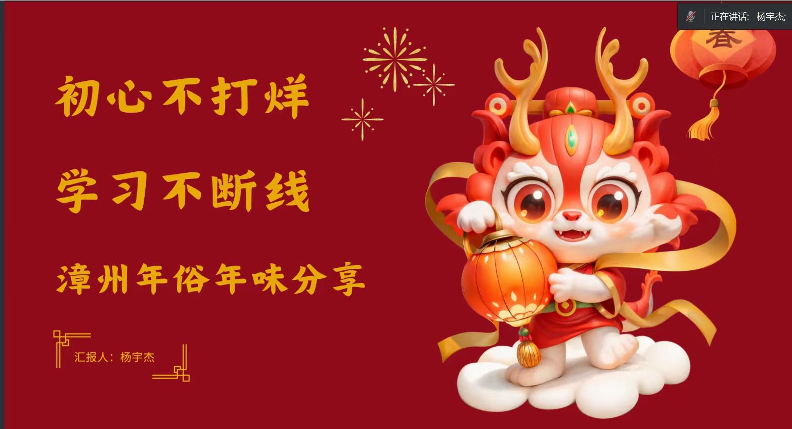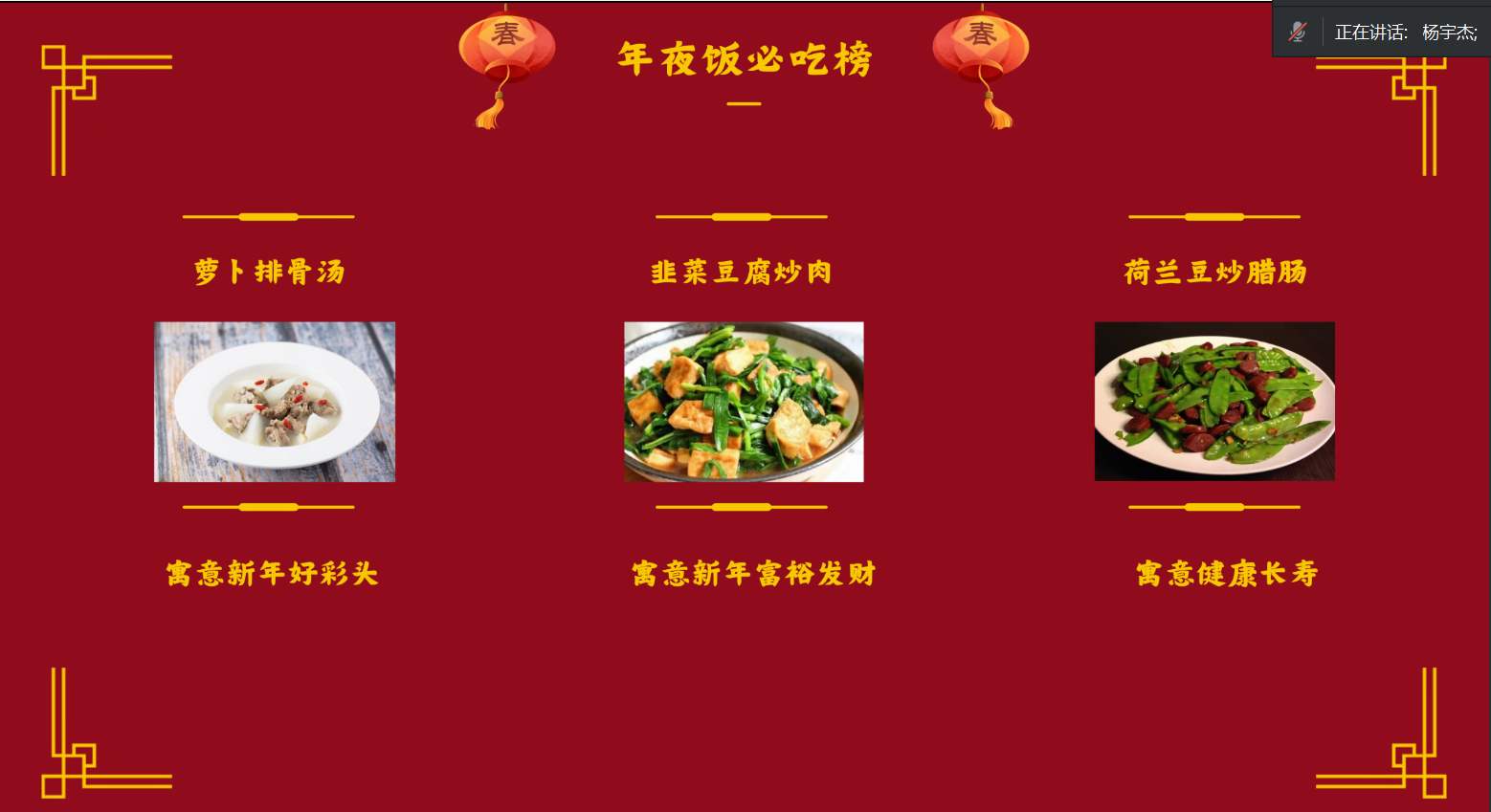 研究生第四党支部于线上展开以“年会不能停”为题的寒假学习交流分享会,旨在加深支部党员对不同地区年俗文化的了解,增加支部成员的文化自信。江门的咸汤圆和鱼灯、长沙的团年饭和花鼓戏、泉州的清水祖师巡游和“踩街”文化、刈香游会、江西赣州的“五股龙”展演和“黄元米果”美食、宁都的三杯鸡…这些传统民俗既是年味的载体、文化的结晶,也是“烟火气”里迎新春的象征。作为新时代的大学生,我们应该发扬这些优秀的传统文化,让年味越来越浓!