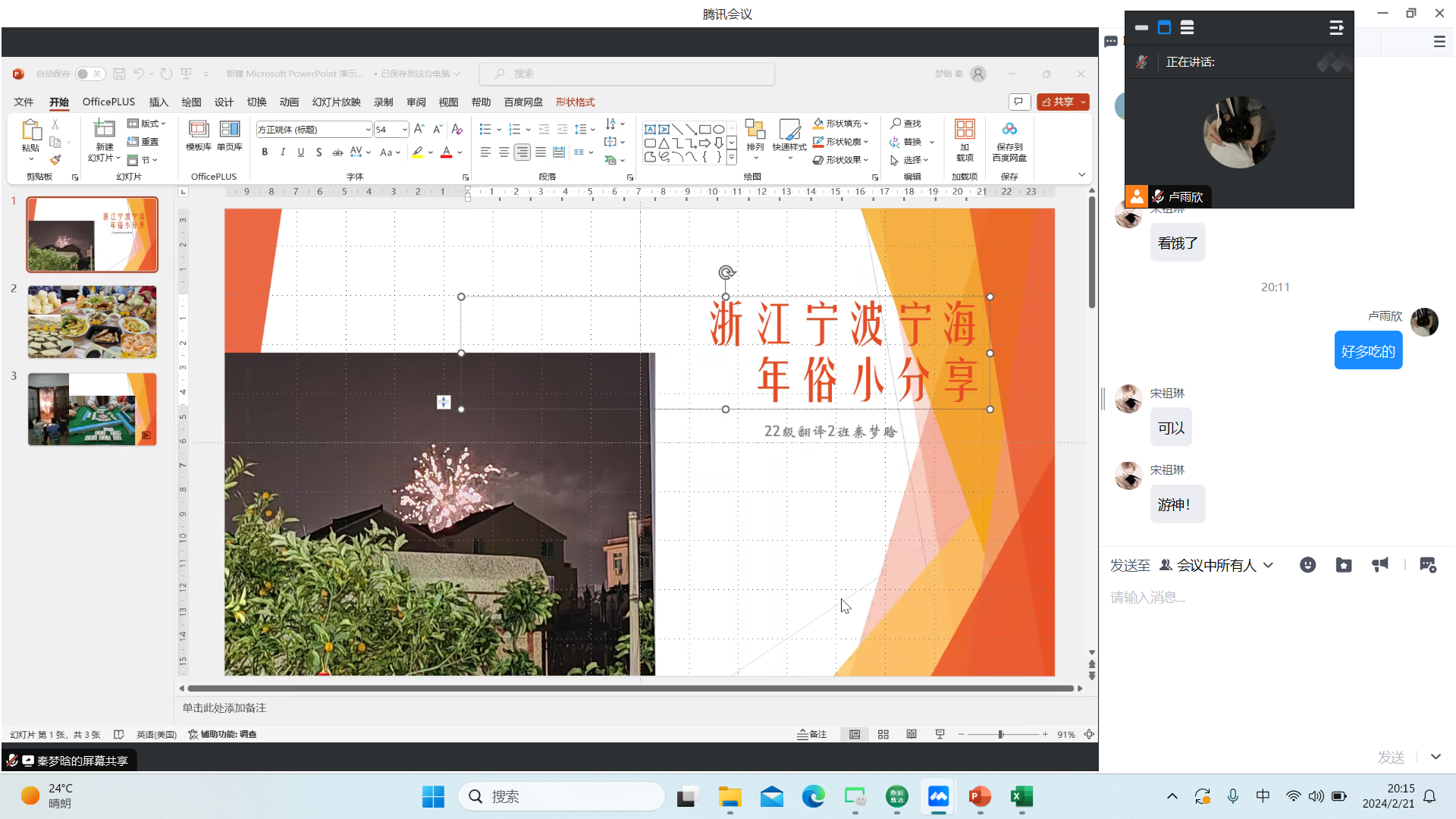 本科生第一党支部开展了家乡年俗年味分享主题。全体党员和预备党员参与其中介绍了各自家乡年夜饭的美食,以及其背后蕴含的传统民俗文化。何欣介绍了福建特色美食糖糕饭,邵笑介绍了山东枣庄辣子鸡,张雅琪介绍了闽南地区的春节特色打边炉。不同地域的饮食文化碰撞间,让我们窥见了中华民族对新年到来始终不变的美好愿景。