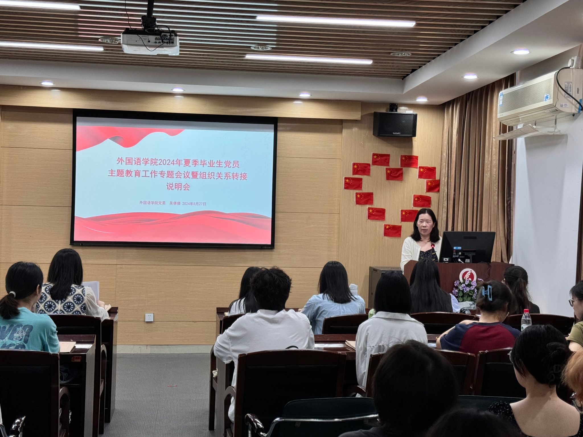 首先,由党委组织员吴倩倩带领参会学生党员重温入党誓词。铮铮誓言再次让党员们感受到信仰的力量。他们纷纷表示,离校后无论身处何地都将时刻牢记党员身份,发挥党员先锋模范作用,为中国式现代化建设贡献自己的力量。随后,吴倩倩向毕业生党员强调了党员档案和党员组织关系的重要性,详细介绍了党员档案归档材料和转接方式、组织关系线上线下转接流程等,并就相关时间节点、注意事项作了重点阐释和要求。最后表示,希望毕业生党员们在今后的学习工作中要始终牢记入党的初心,开展一次“要毕业了,我对外院有话说”毕业寄语征集活动,要求全体毕业生党员坚持以习近平新时代中国特色社会主义思想为指导,尊崇党章、遵守党规,学好党纪,不忘初心、牢记使命,进一步增强“四个意识”、坚定“四个自信”,坚决做到“两个维护”,在文明离校过程中和走向社会后,都要努力发挥好党员的先锋模范作用,最后祝福大家,前程似锦,毕业快乐!常回来看看。