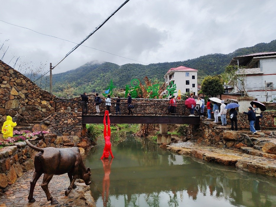 接着,大家参观了由泉州籍国际艺术家陈文令领衔打造、以"冶铁文化"为魂的青阳溪岸艺术公园。田间矗立的"打铁三兄弟"雕塑群像以钢铁身躯讲述非遗精神,河岸边憨态可掬的铜牛家族雕塑与之遥相呼应。通过在地资源的创新改造,废弃的猪舍鸭棚经"出砖入石"传统工艺蜕变而成的"天猪一条街"上,茶室、陶瓷店、藤艺铺等业态一应俱全;老船木构筑的侘寂空间与潺潺流水、阡陌田园浑然一体,形成传统工艺与现代艺术碰撞的独特景观。陈文令先生还在家乡打造了亲水亲绿亲民的"金谷溪岸"乡村艺术公园并无偿开放,这个项目不仅激活了一方土地,更聚拢人气滋养民心,为僻静乡村注入无限可能。