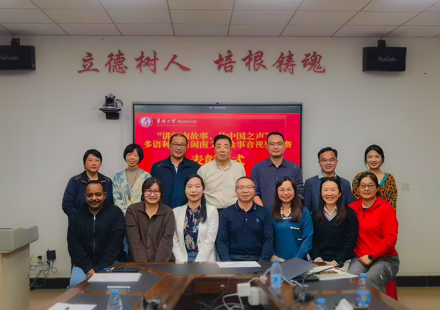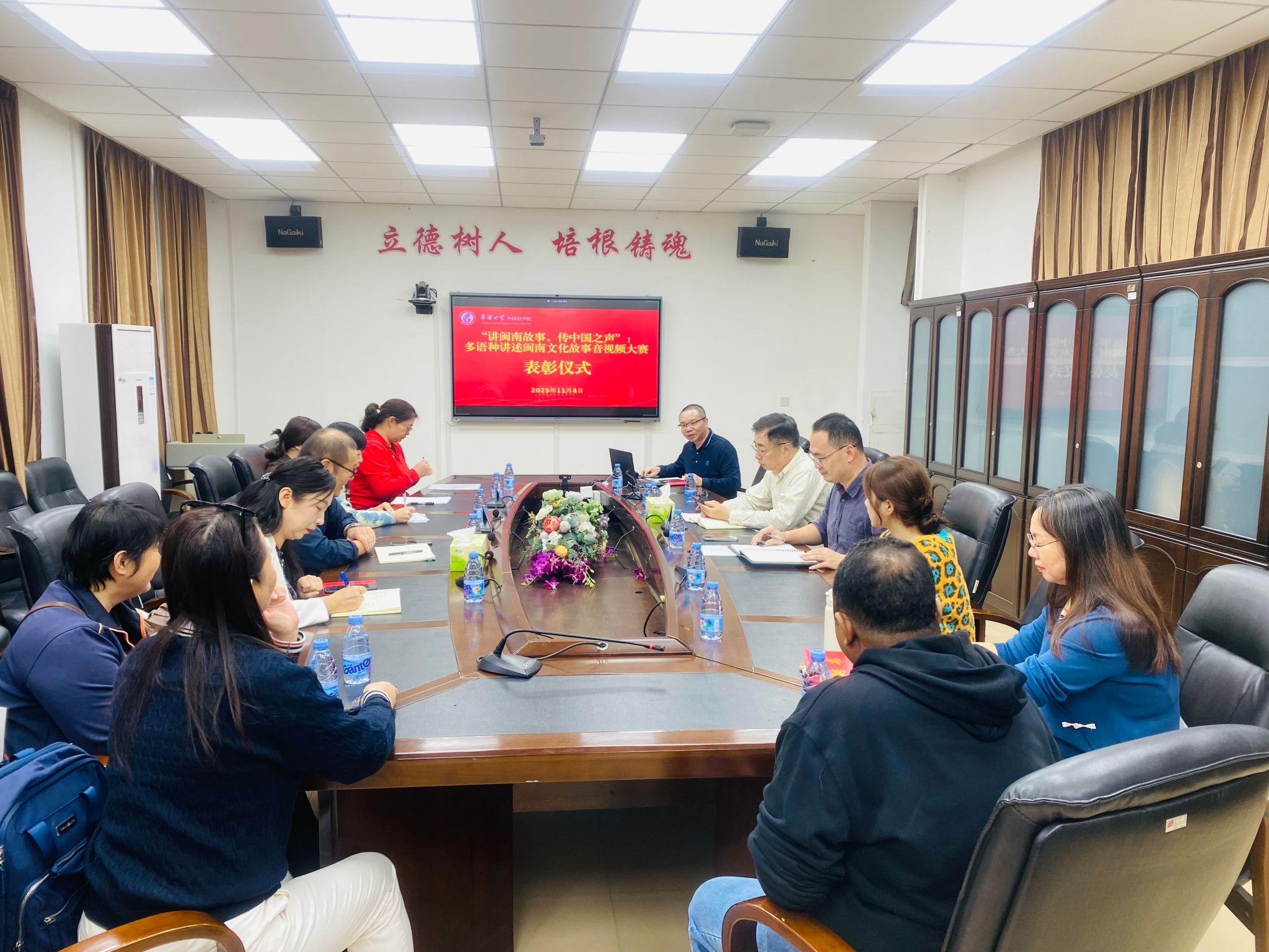 卢植院长在讲话中对本次大赛的丰硕成果表示高度赞赏。他充分肯定了教师们运用新技术挖掘闽南文化、赋能国际传播的实践,称赞这是“讲好中国故事”能力的精彩展示,并鼓励大家将比赛收获融入日常教学,在外语教学中不断深化对中国文化的理解与阐释。他还特别强调,本次大赛所涌现的高质量、多语种音视频成果,将为学院系统构建“侨文化语料库”奠定重要的内容基础。