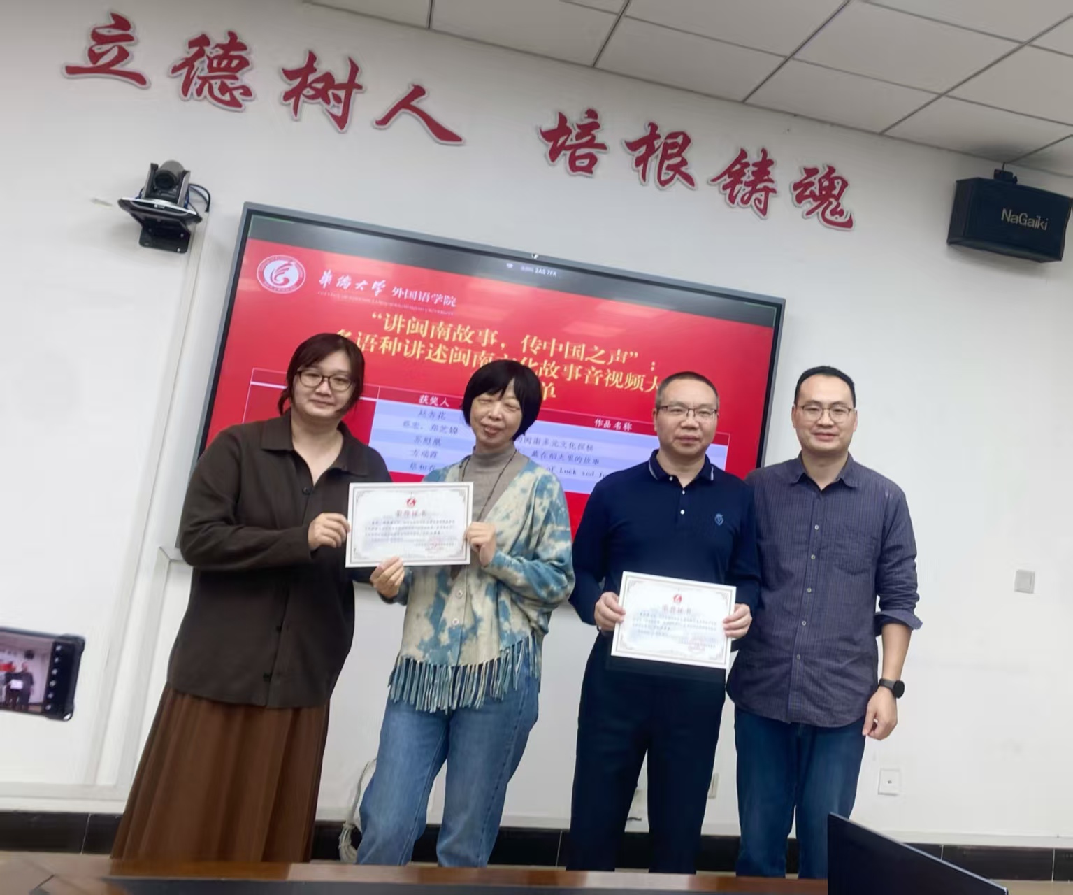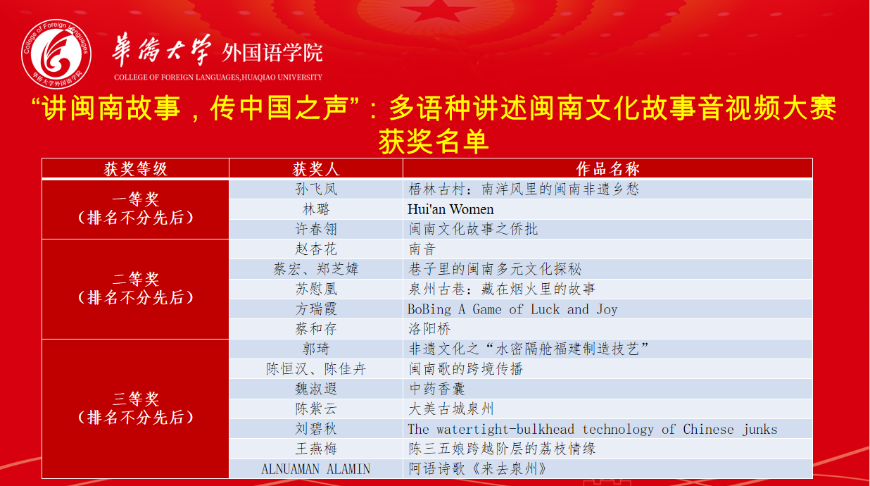 本次大赛得到了全院教师的积极响应,收到涵盖英语、日语、中文、阿拉伯语等多个语种的优秀作品。最终经专业匿名评审,评出一等奖、二等奖、三等奖共15名。《梧林古村:南洋风里的闽南非遗乡愁》(孙飞凤)、《Hui’an Women》(林璐)、《闽南文化故事之侨批》(许春翎)三部作品荣获一等奖。获奖作品主题丰富,制作精良,内容广泛触及世遗景点、非遗技艺、华侨文化、民间戏曲等多个领域,并有部分作品运用AI技术手段,为传统文化赋予了新颖的视觉表达。