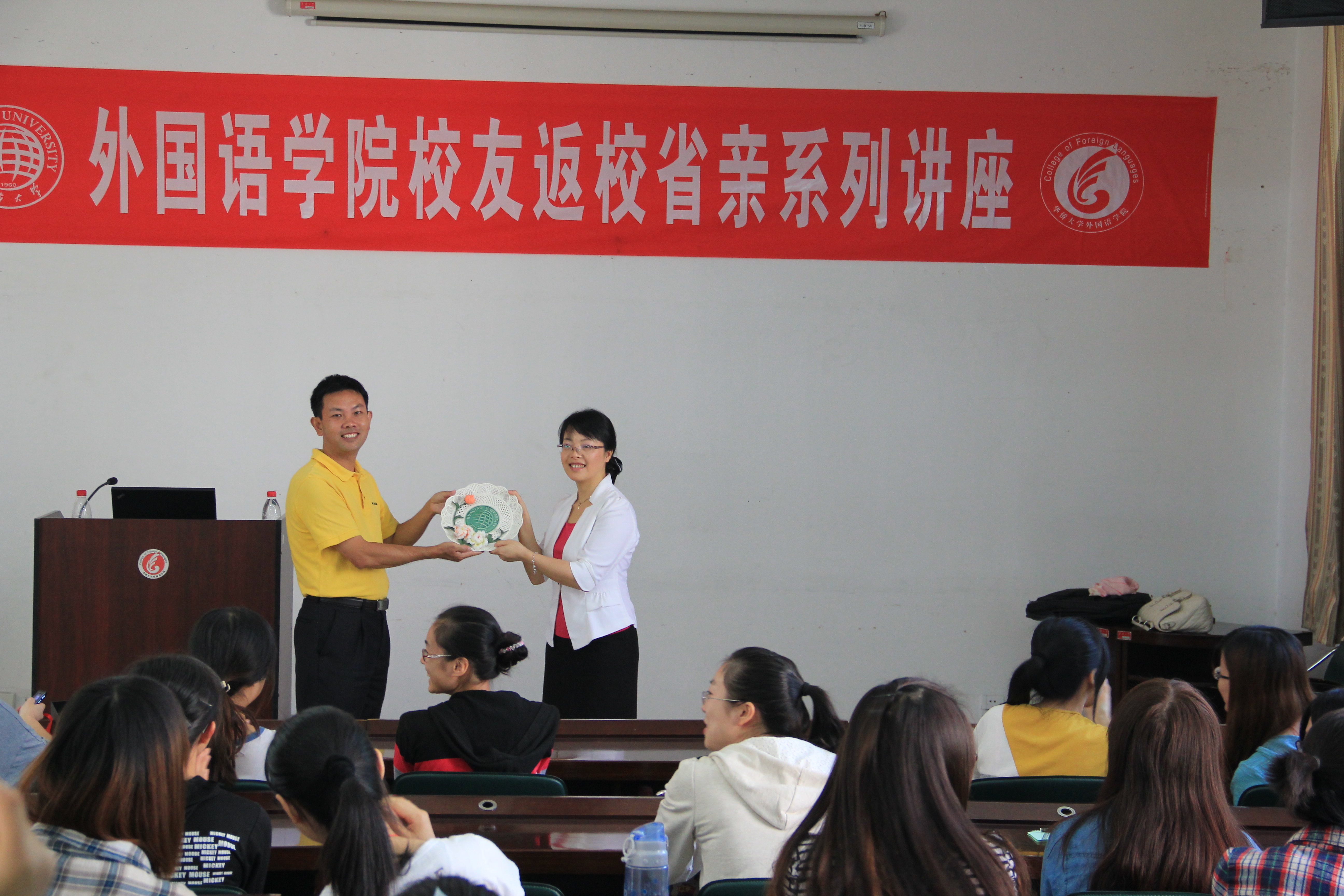 2012年10月20日上午九时,永利23411集团校友返校省亲系列专题讲座开讲。首讲“职场礼仪--人生的必修课”在外院三楼大会议室举行。我院厦门校友会副会长、91级英语系学姐苏芸主讲。讲座由院党委副书记林庆祥老师亲自主持,他还代表学院将华园印象寓意“花开富贵、春满华园"等德化陶瓷工艺品赠与主讲嘉宾,感谢苏芸校友心系学院、关爱在校学生,两趟从厦门专程返校参加2012级新生入学教育和举办专题讲座,现场一片掌声雷动。