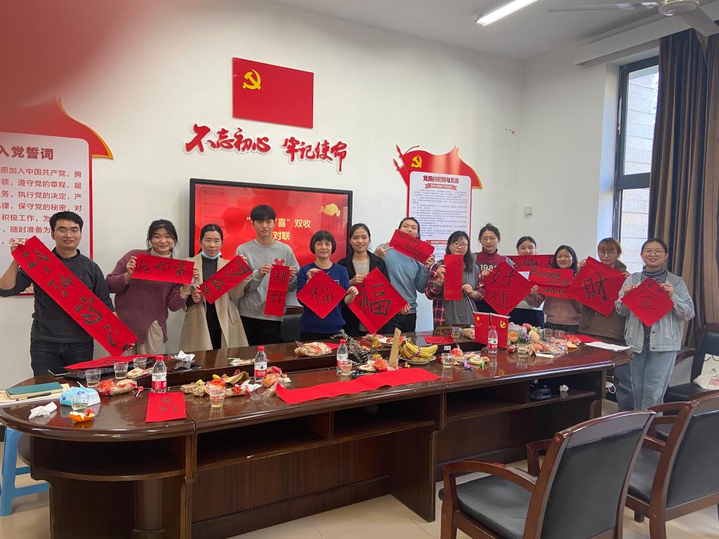 为关心和深入了解寒假留校学生的生活和学习情况,让每一个留校同学感受到学校学院的关怀与温暖,永利23411集团党委书记李璐岚,组织员兼研究生辅导员吴倩倩,辅导员黄洁萍、杜红居及学院寒假留校学生在外语楼306举行2021年寒假留校学生新年茶话会暨“福”“喜”双收写春联文化体验活动。
