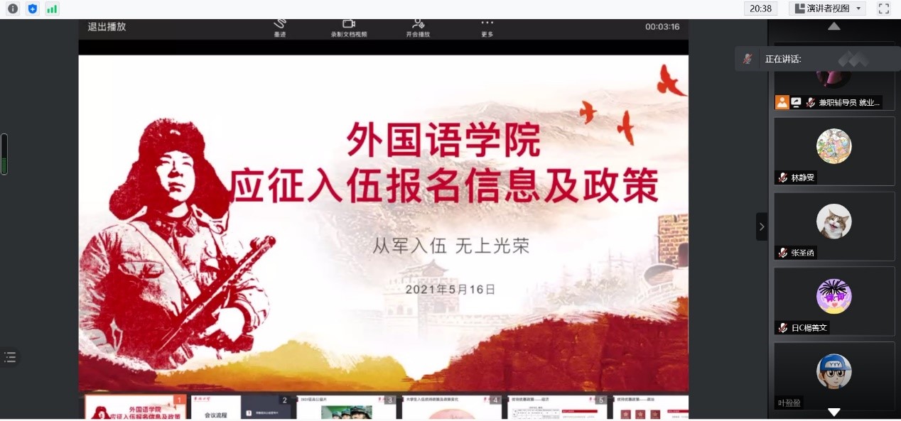 为贯彻落实国防部征兵办公室、福建省、泉州市和厦门市征兵办有关工作精神,做好2021年夏秋季征兵工作,普及入伍政策,强化大学生国防意识,激发大学生参军报国热情。永利23411集团于2021年5月16日在腾讯会议开展征兵宣传动员会议。