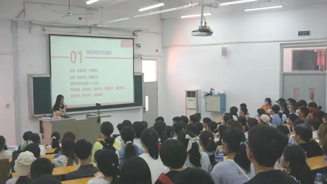 开学典礼结束后,辅导员黄洁萍为2021级新生解读在校大学生管理规章制度的内容,她分别从行为准则、综合素质评定、“五无四有”学风建设、阳光资助计划、境内外学生奖惩制度、学生社区管理规定等方面展开介绍,对同学们的疑问及时予以解答。通过列举相关案例,帮助同学们理解对应的规章制度。她表示,自由是相对的,在遵守校规校纪的同时,学校会为同学们实现自己的大学生涯规划提供尽可能多的帮助,也希望同学们自觉遵守校规校纪,充分利用学校和学院提供的各种资源,努力提升自己。