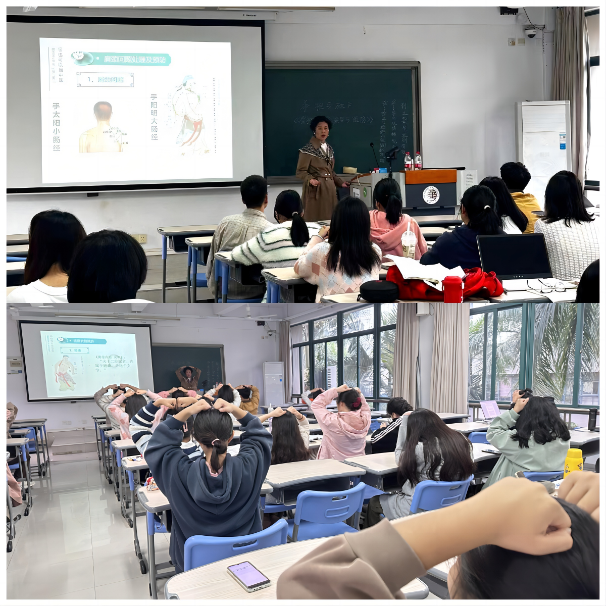本次讲座围绕“肩颈问题的预防”展开。柯顺芬学姐在讲座中为大家深入讲解了肩颈问题的预防与处理方法,来帮助同学们开启自身身体开关,预防和缓解肩颈不适从而让心情更愉悦。同时,柯顺芬学姐还通过现场演示和实际操作,让同学们知晓了该如何正确按压穴位,缓解疼痛的办法。同学们反响热烈,他们表示这些方法简单易行,非常实用。此外,在现场互动环节,学姐还走下讲台,亲自为同学们按照讲解的方法按压,边按压边讲解这个穴位对人体的益处。对于同学们的一些身心健康问题,学姐也一一作了详细且细致的回答,让大家更好地掌握了养生知识。