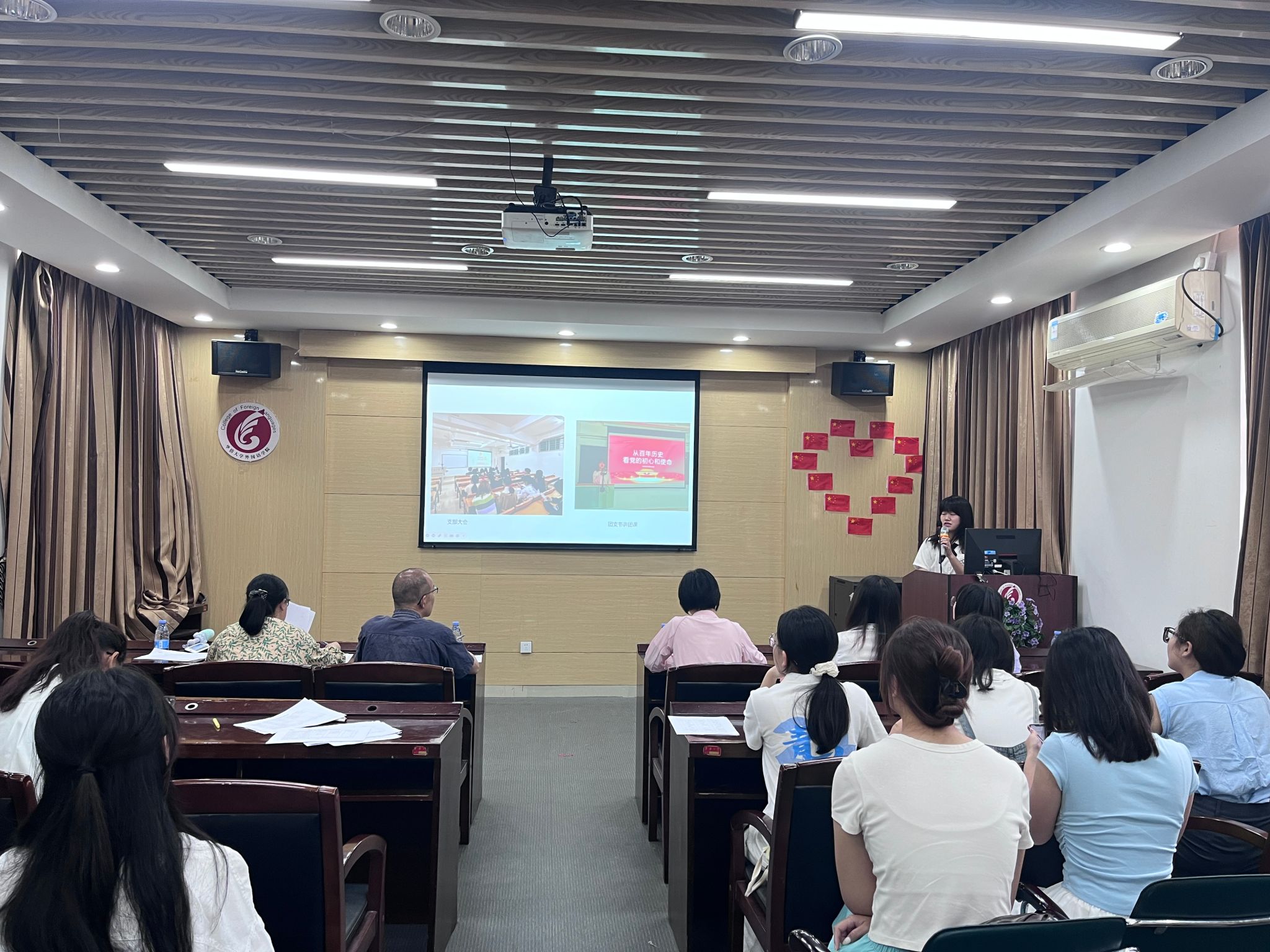 为全面展现我院团支部的风采和成果,提升基层团组织的引领力、组织力、服务力,2024年5月18日,我院于外院207开展2022级团支部评审汇报会。出席本次评审活动的评委老师有我院2022级英语1班班主任邱琳老师、2022级英语3班班主任戴小春老师、2022级翻译1班班主任陈恒汉老师、2022级日语2班班主任郭莉老师及2022级辅导员苏安妮老师,到场的还有各班学生代表。