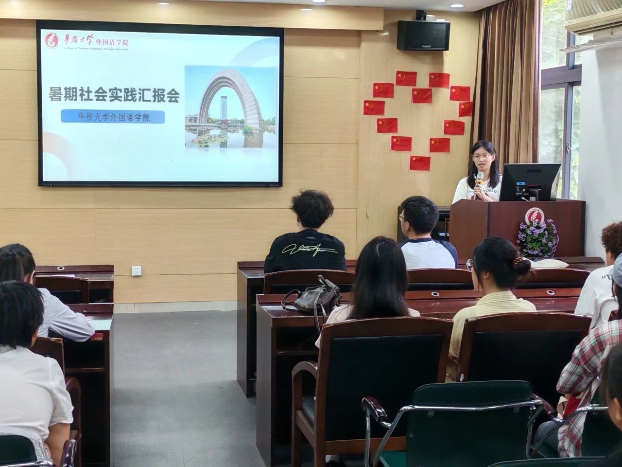 22级日语专业吴灵欣同学在暑期社会实践汇报会上分享经验。她认为,社会实践过程中,作为新时代新青年,应该勇于承担社会责任,努力学习不同技能,并在不同场景进行运用,需要努力培养自身应对挑战困难的能力、“遇事不慌,随机应变”的能力。
