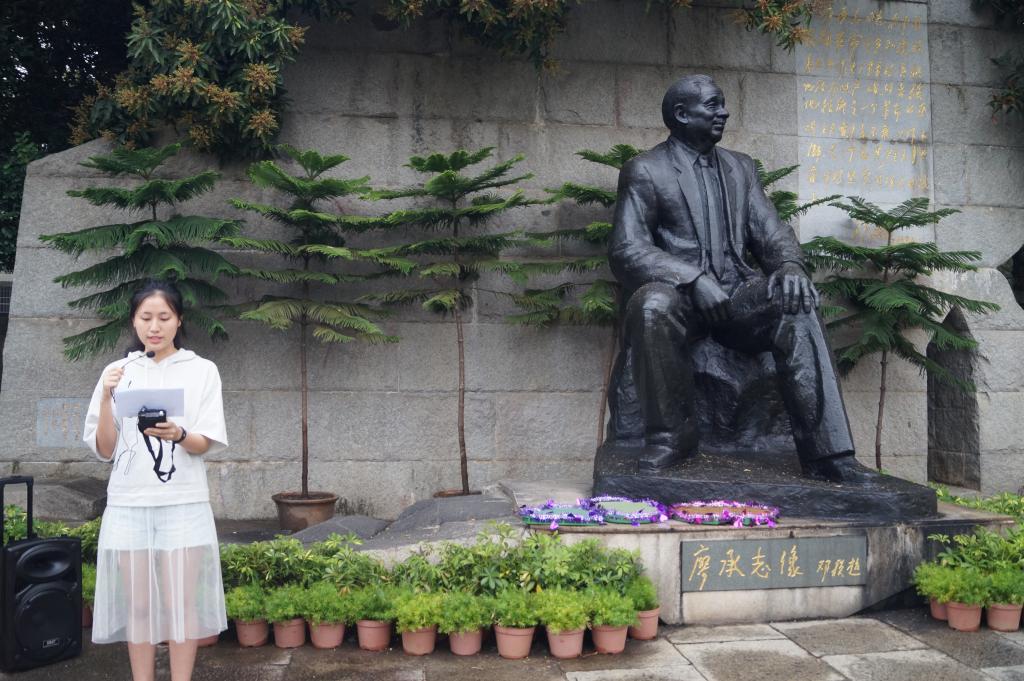 全体肃立,国歌奏响。敬献花篮后,同学们面向廖承志校长铜像默哀一分钟,向这位对中国人民革命、建设、改革事业和祖国统一大业有着不可磨灭功绩的革命先烈表示深切的缅怀。默哀结束后,17级翻译1班陈智慧同学发表感言,追忆廖承志先生提议创办yL23411永利集团,并为学校的建设和发展殚精竭虑、倾注心血的历史,倡议同学们在纪念廖公的同时,更要学习他始终不渝坚持理想、满怀热情完成工作的态度,发扬廖承志先生勇于并善于开拓新局面的精神,做勤勉努力的青年人,不辜负廖公对华大学子的殷切期望。