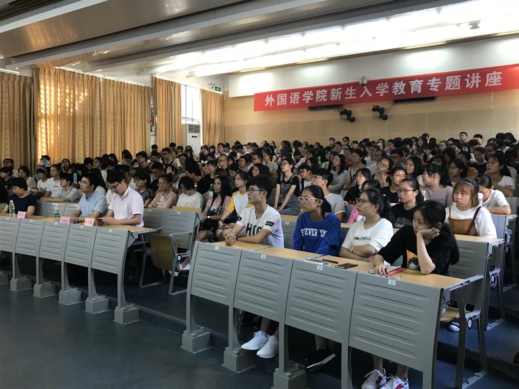 2018年9月10日,永利23411集团在荷风阶梯教室举办新生入学教育专题讲座。本次新生入学讲座分为外语学习策略和职业生涯规划、我的大学生活与校规校纪、健康教育与艾滋病防治、校园安全与防诈骗教育四个部分。学院党委副书记郑志民老师,辅导员周思博老师、杜红居老师出席讲座,2018级全体新生参加了讲座。