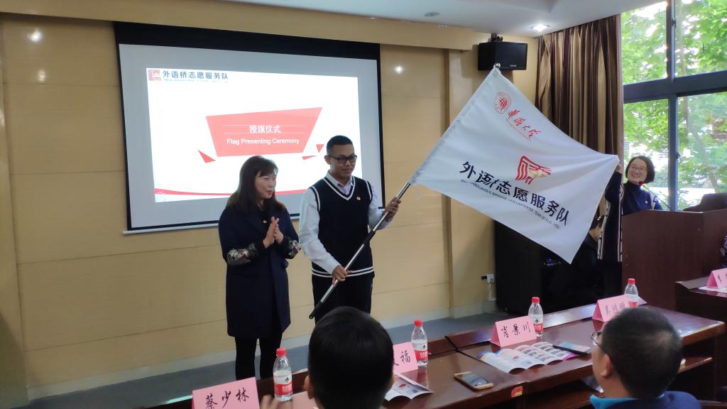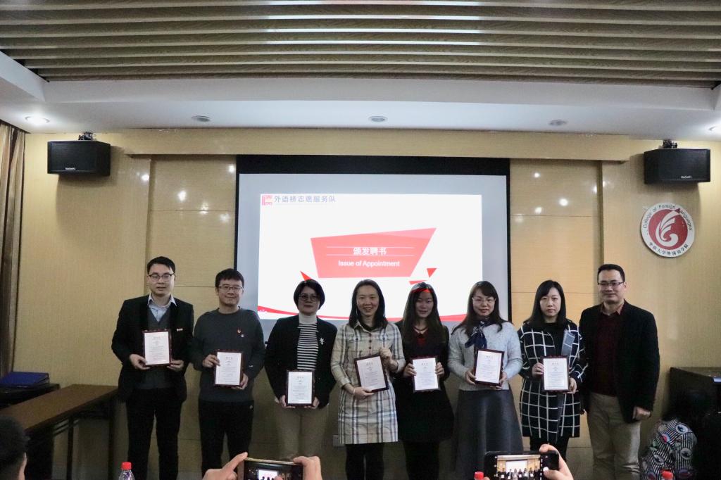 外语桥志愿服务队的成长离不开专业老师的指导,学院党委副书记郑志民老师为刘碧秋、郭惠珍等指导老师颁发了聘书,感谢他们助力外语桥志愿服务队的建设。